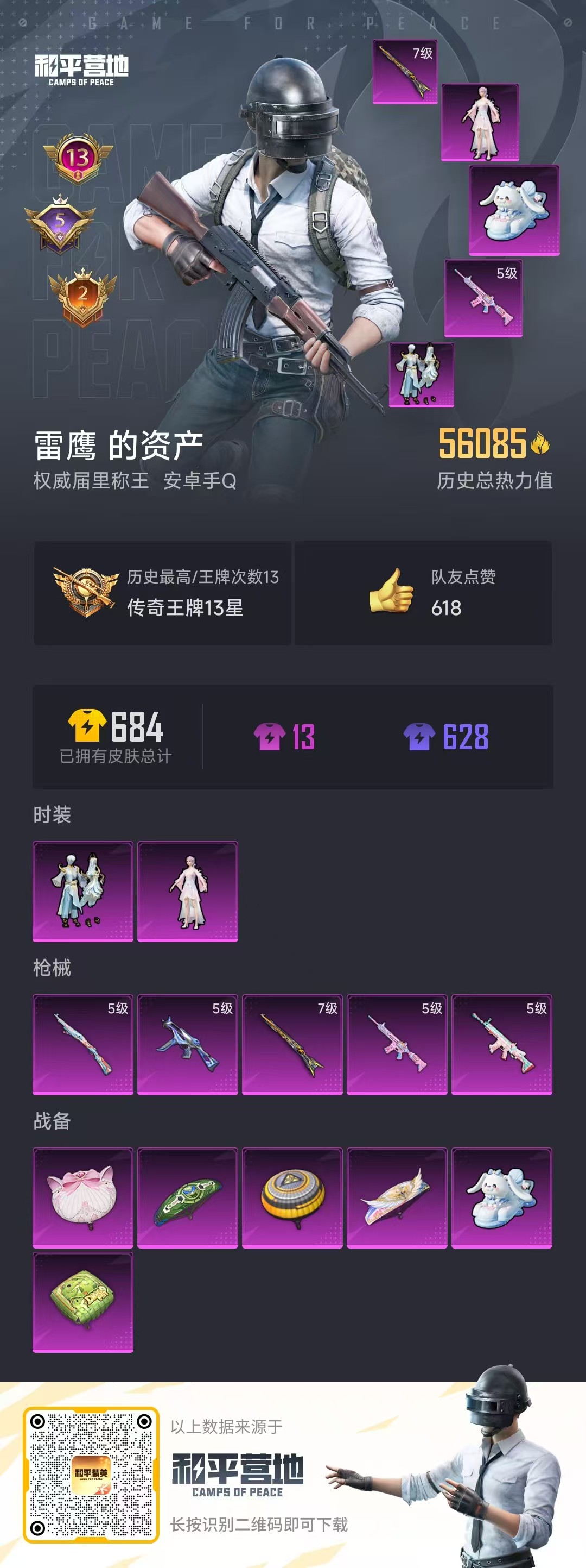 [10320190]实名: 不可修改 时装数: 574 枪械数: 192 战备数: 149 热门装扮: 烟云彩露,金丰海韵 稀有枪皮: SCAR-L-锦绣绵绵,M416电玩时刻,Kar98K创世·救赎,UMP45量子极限,Kar98K-巳巳如意