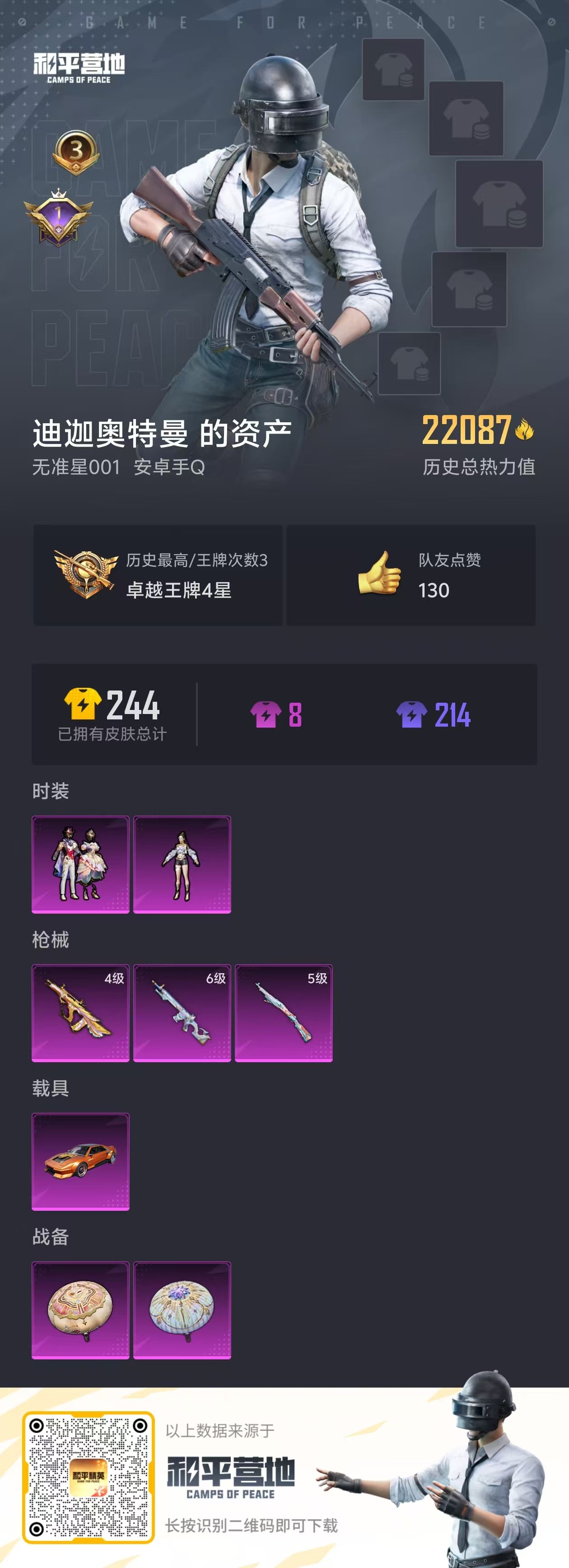 [10153942]实名: 可修改 时装数: 150 载具数: 1 枪械数: 79 战备数: 46 热门装扮: 时空协奏·回响,星穹咏叹调 载具: 天马凌跃(星芒橙) 稀有枪皮: Kar98K-巳巳如意,MK12-雪月幻音,AUG-圣斗士星矢
