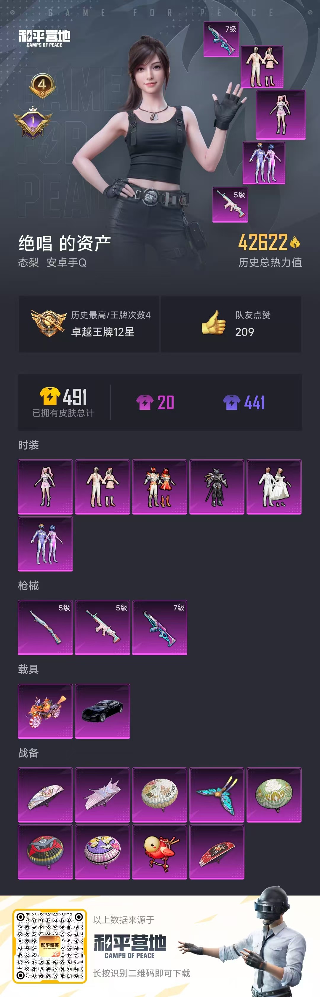 [9786247]实名: 可修改 时装数: 365 载具数: 2 枪械数: 137 战备数: 87 热门装扮: 梦幻火箭(新101),飓风飞鹰,霞光圣骑,心之回忆,第五大道,时空协奏·心弦 载具: 鬼马风驰,玛莎拉蒂Quattroporte(夜幕蓝) 稀有枪皮: AKM梦之光华,SCAR-L-锦绣绵绵,Kar98K-巳巳如意