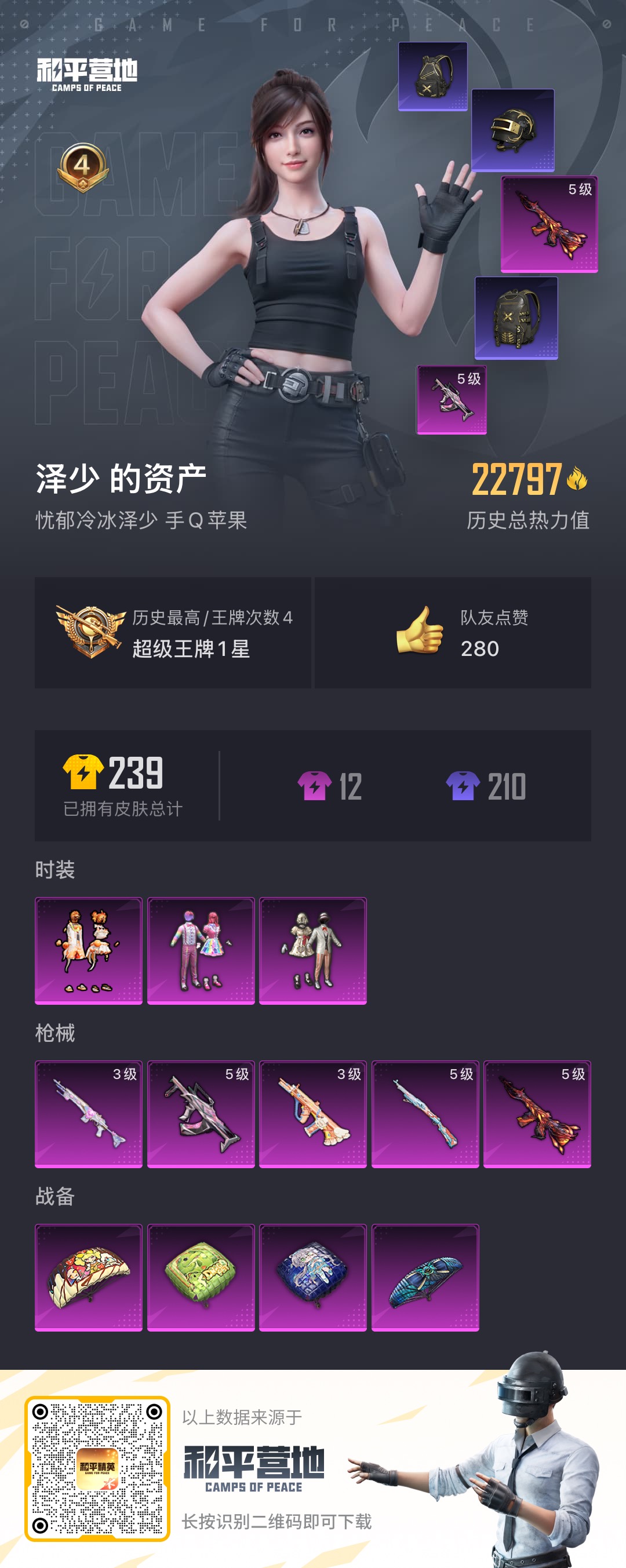 [9854097]实名: 可修改 时装数: 196 枪械数: 65 战备数: 43 热门装扮: 宝贝奶油派,天使彩虹糖,橘柚倾心,暗夜魅影 稀有枪皮: M416风花雪月,GROZA-镜光银凌,Kar98K-巳巳如意,AUG-暖羊咩咩,MK14-甜梦熊击