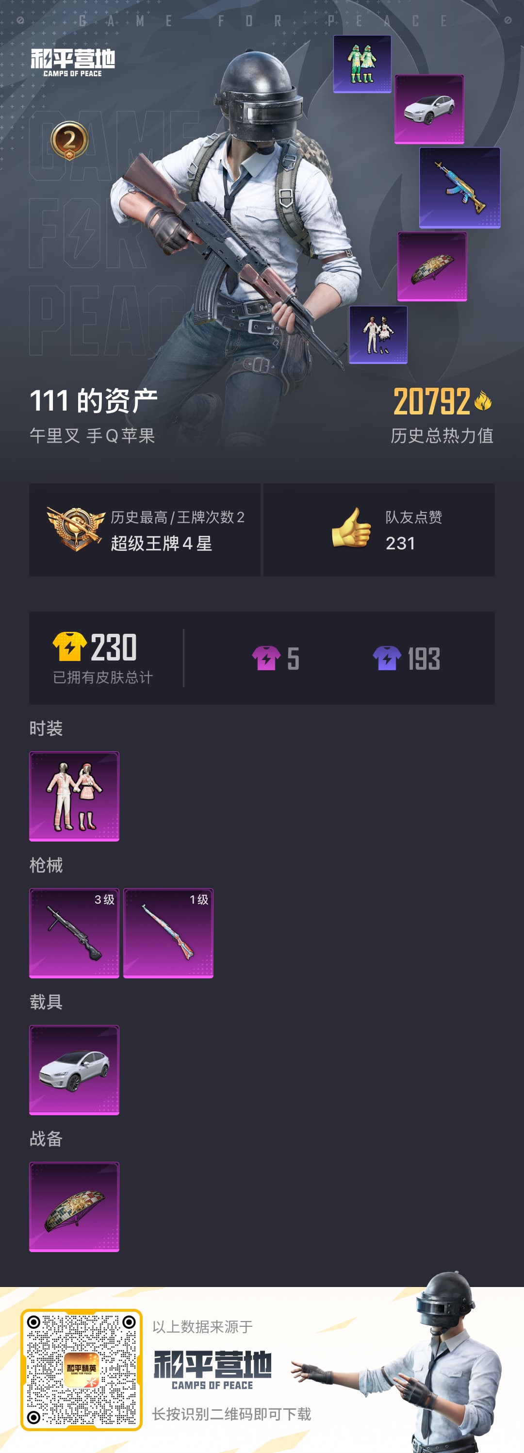 [11004458]实名: 可修改 时装数: 278 载具数: 1 枪械数: 61 战备数: 45 热门装扮: 第五大道 载具: 特斯拉Model X(珍珠白) 稀有枪皮: Kar98K-巳巳如意,DP-28-豹影疾电