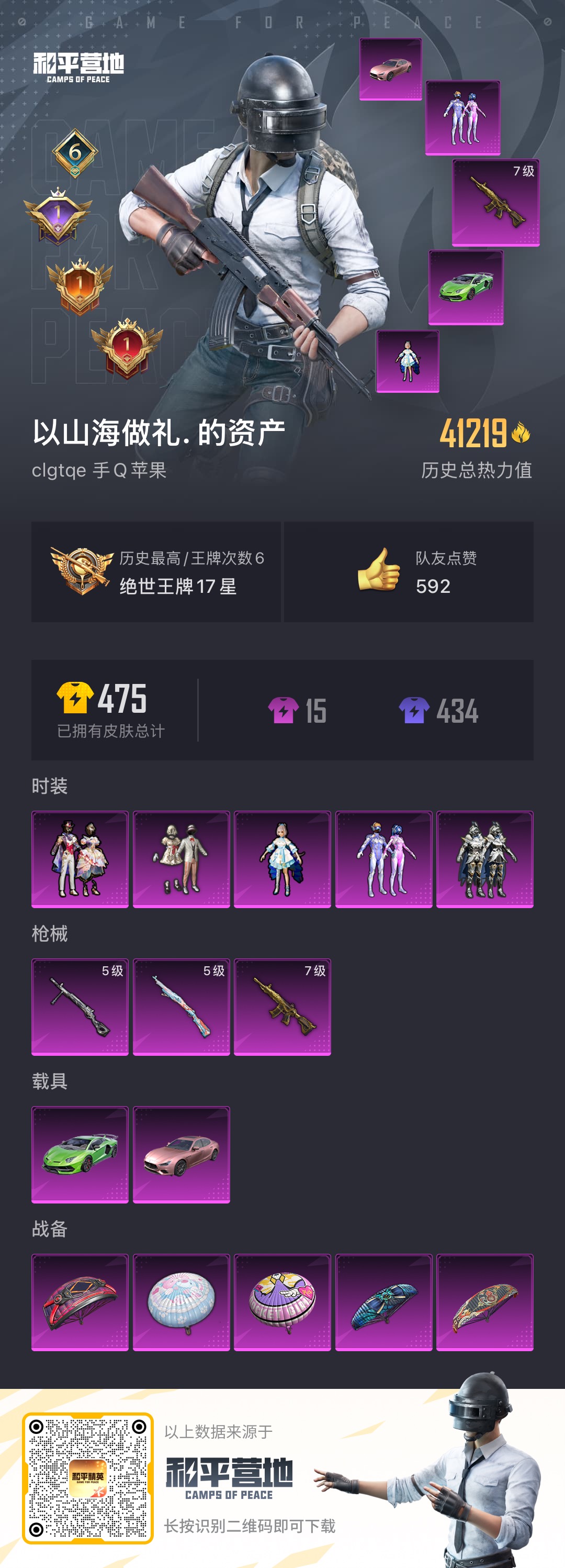 [11436478]实名: 可修改 时装数: 419 载具数: 2 枪械数: 138 战备数: 83 热门装扮: 梦幻火箭(新101),宝贝奶油派,鹰眼刺客,洛天依,银龙傲海,暗夜魅影,星穹咏叹调 载具: 玛莎拉蒂Ghibli(粉),兰博基尼Aventador SVJ(翡翠绿) 稀有枪皮: M416五爪金龙,Kar98K-巳巳如意,DP-28-豹影疾电