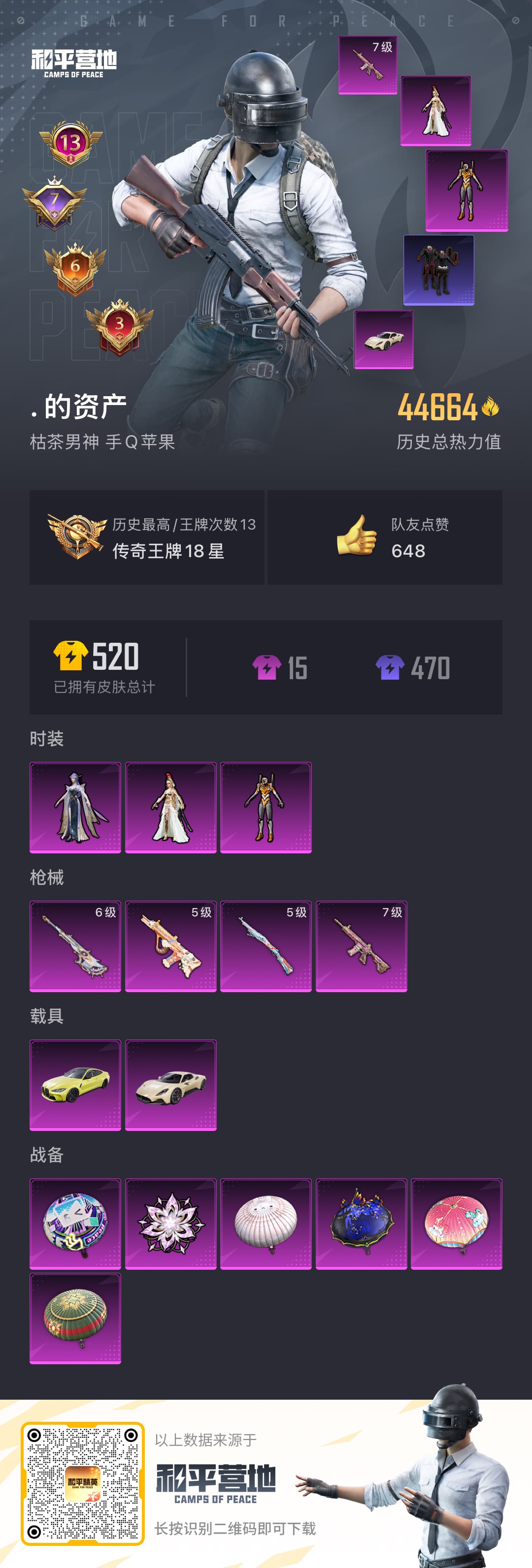 [10262831]实名: 可修改 时装数: 409 载具数: 2 枪械数: 143 战备数: 119 热门装扮: 梦魇先生,零号机款机体服,萨利娅,天穹 载具: 玛莎拉蒂MC20(星石白),宝马M4(圣保罗黄) 稀有枪皮: M416心之恋语,Kar98K-巳巳如意,AUG-暖羊咩咩,AMR-智耀战神