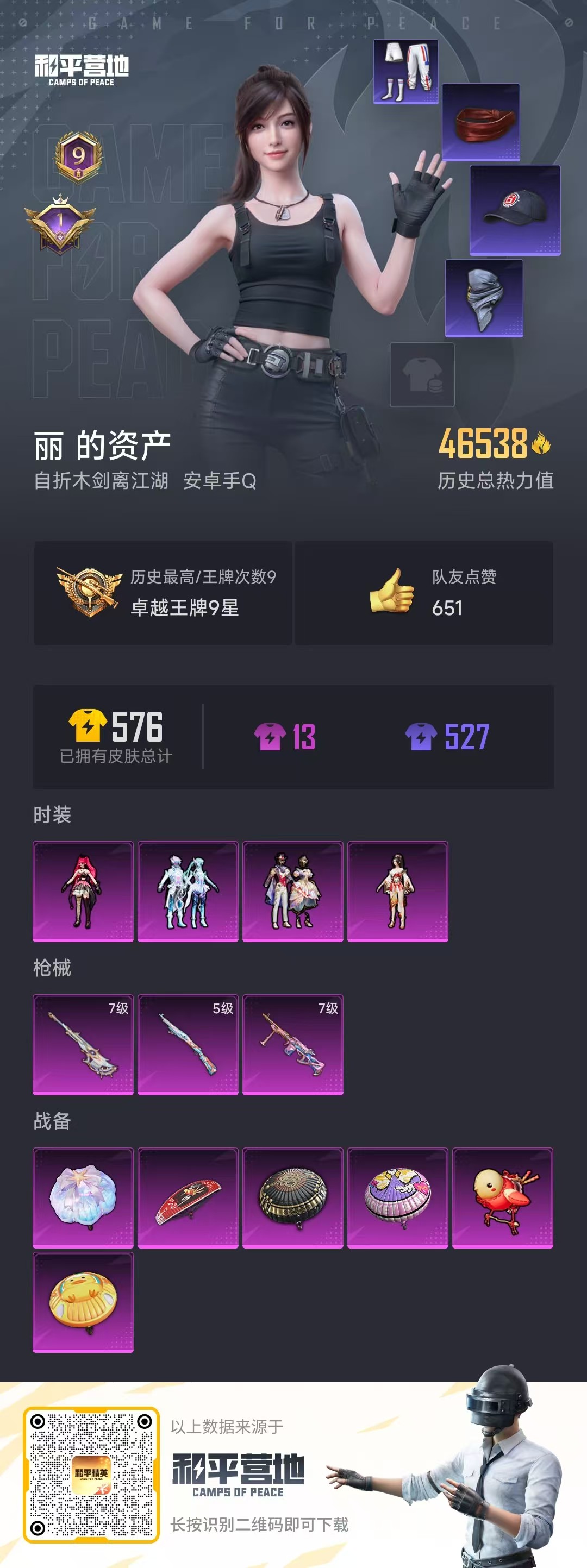 [10217539]实名: 可修改 时装数: 532 枪械数: 169 战备数: 116 热门装扮: 呆萌铁蟹,鹰眼刺客,都市猎人,星兔领航员,狂花道·不知火舞,星穹咏叹调,幻彩电音,绯穹魔姬 稀有枪皮: PKM-守护天翼,Kar98K-巳巳如意,AMR-智耀战神