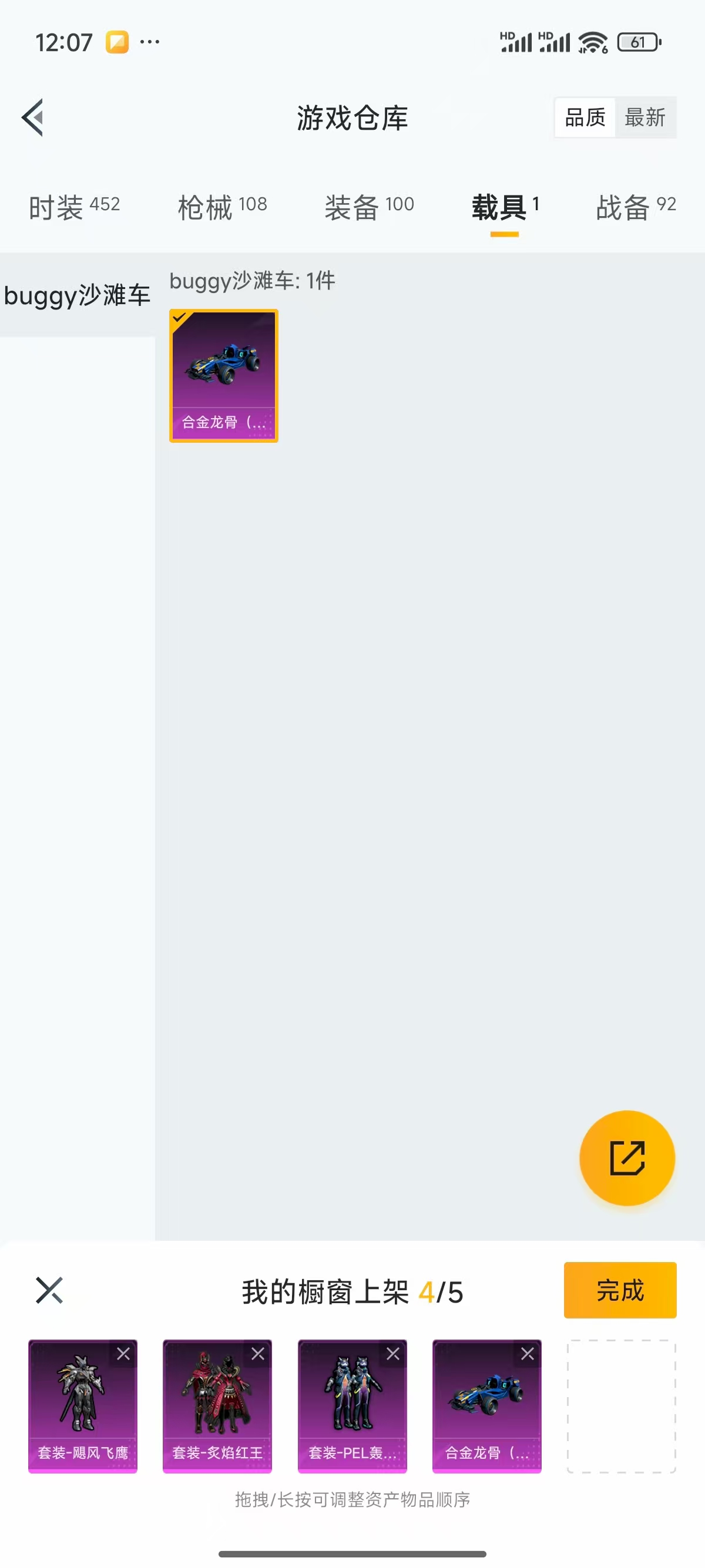 [10270611]实名: 可修改 时装数: 452 载具数: 1 枪械数: 108 战备数: 92 热门装扮: 梦魇先生,PEL轰鸣竞梦者,炙焰红王,飓风飞鹰,奇迹天团,蔷薇魔法师 载具: 合金龙骨(蓝)