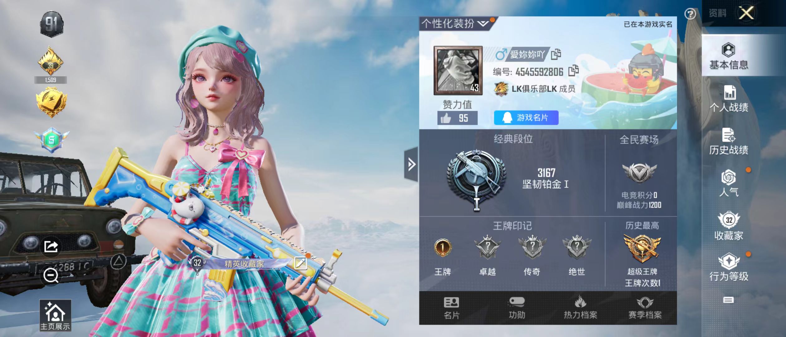 [10716987]实名: 不可修改 时装数: 260 枪械数: 66 战备数: 46 热门装扮: 青空秋雨 稀有枪皮: Kar98K-巳巳如意,DP-28-豹影疾电