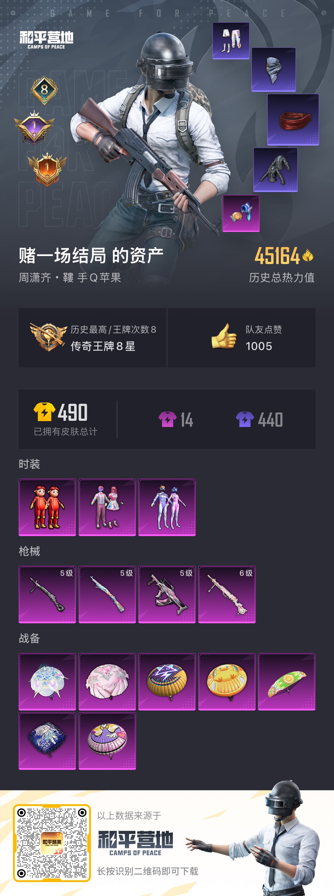 [10966143]实名: 可修改 时装数: 451 枪械数: 156 战备数: 92 热门装扮: 奇异狩猎者,梦幻火箭(新101),深海小丑鱼,天使彩虹糖,鹰眼刺客,都市猎人,猪猪侠 稀有枪皮: DP-28-千金淑猫,GROZA-镜光银凌,Kar98K-巳巳如意,DP-28-豹影疾电