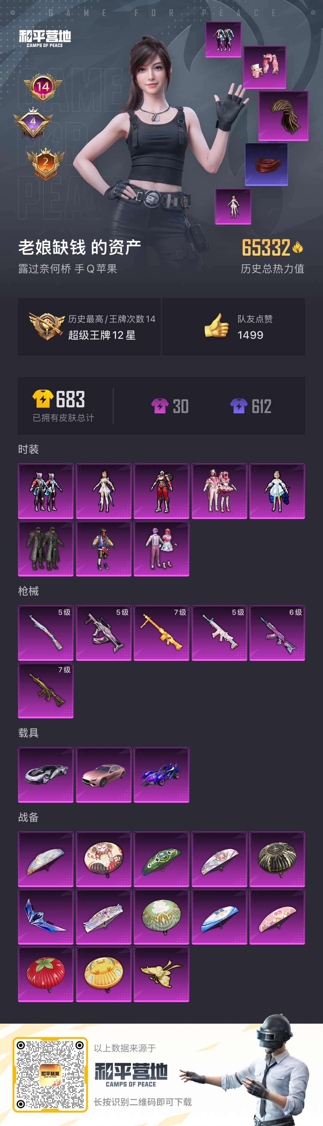 [10319881]实名: 可修改 时装数: 482 载具数: 3 枪械数: 202 战备数: 122 热门装扮: 未来战士,呆萌铁蟹,天使彩虹糖,梦魇先生,天禅智恒,馨动时刻,洛天依,阿尔茜,圣堂之誓,幻影飞狐 载具: 玛莎拉蒂Ghibli(粉),海龙奔腾,时空跃影(星辉银) 稀有枪皮: AKM炫紫旋律,M416五爪金龙,MG3酷泡奶龙,SCAR-L-锦绣绵绵,GROZA-镜光银凌,Kar98K-巳巳如意