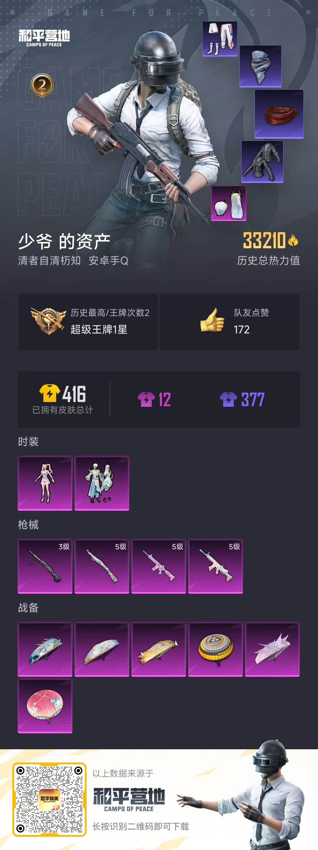 [11014553]实名: 可修改 时装数: 392 枪械数: 114 战备数: 85 热门装扮: 鹰眼刺客,都市猎人,金丰海韵,时空协奏·心弦 稀有枪皮: SCAR-L-锦绣绵绵,M416电玩时刻,Kar98K-巳巳如意,DP-28-豹影疾电