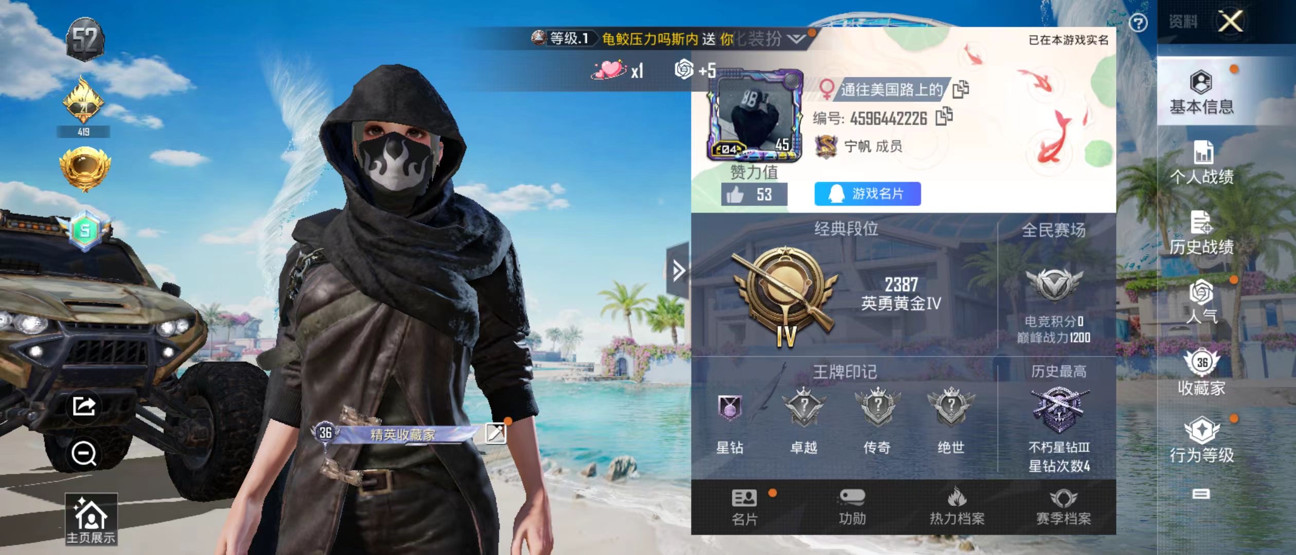 [10849697]实名: 可修改 时装数: 333 枪械数: 93 战备数: 69 热门装扮: 冷漠罗丽 稀有枪皮: GROZA-镜光银凌,Kar98K-巳巳如意,AUG-暖羊咩咩