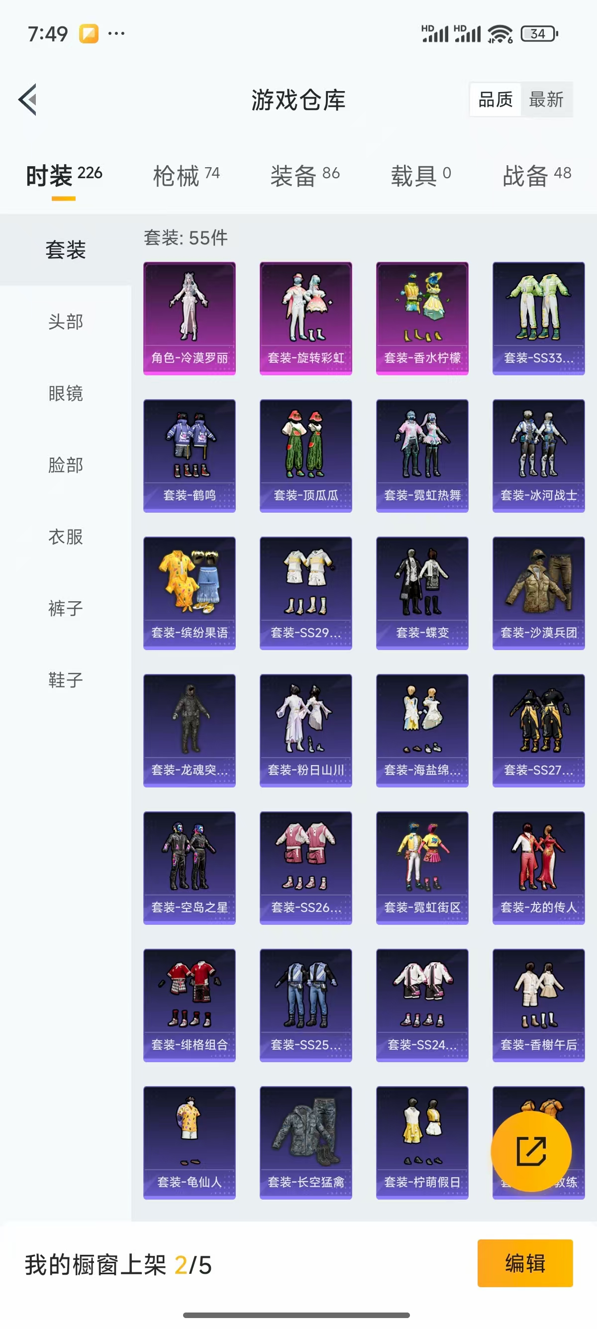 [11238812]实名: 可修改 时装数: 226 枪械数: 74 战备数: 48 热门装扮: 香水柠檬,旋转彩虹,冷漠罗丽 稀有枪皮: M416心之恋语,SCAR-L纯梦嫁纱,DP-28-豹影疾电
