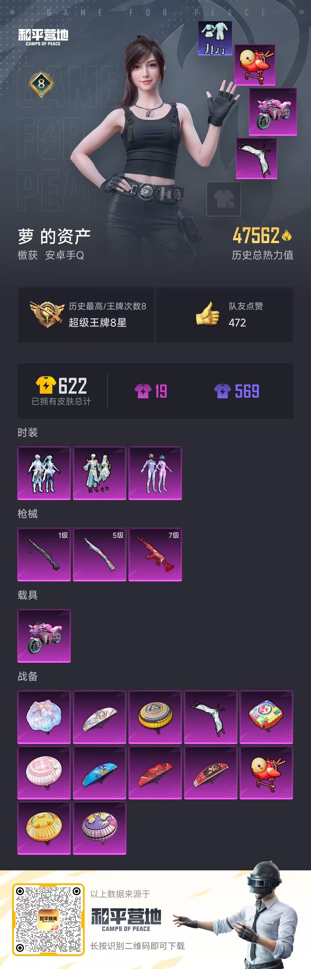 - PX_2096098- 安卓手Q-18王牌印记-6粉装-8特效枪-1载具-84528热力值-198套装-249枪皮-10卓越印记-3传奇印记 【6粉装】,雪月幻音,星夜魔法师,未来歌姬,仲夏莫吉托,创世·救赎,电磁星 【8特效枪】SCAR-L-锦绣绵绵-5级 M416-五爪金龙-7级 GROZA-镜光银凌-5级 AUG-暖羊咩咩-5级 M762-青锋波束-5级 Kar98K-巳巳如意-5级 Mk1
