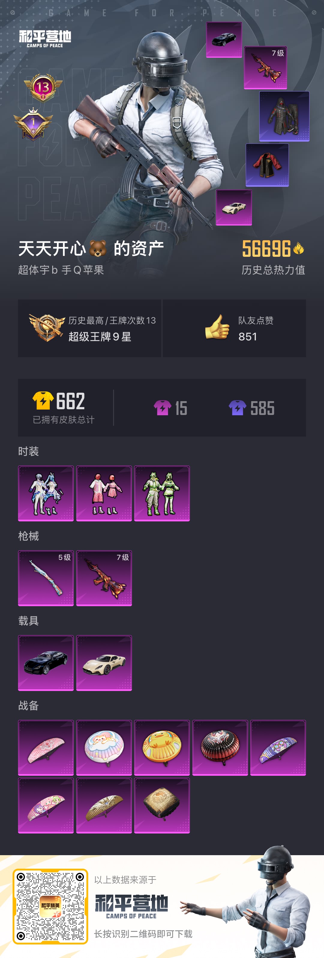 [10730659]实名: 可修改 时装数: 558 载具数: 2 枪械数: 183 战备数: 135 热门装扮: 奇异狩猎者,碧影闪光,S1赛事上衣,飒粉甜心,未来歌姬 载具: 玛莎拉蒂MC20(星石白),玛莎拉蒂Quattroporte(夜幕蓝) 稀有枪皮: M416风花雪月,Kar98K-巳巳如意