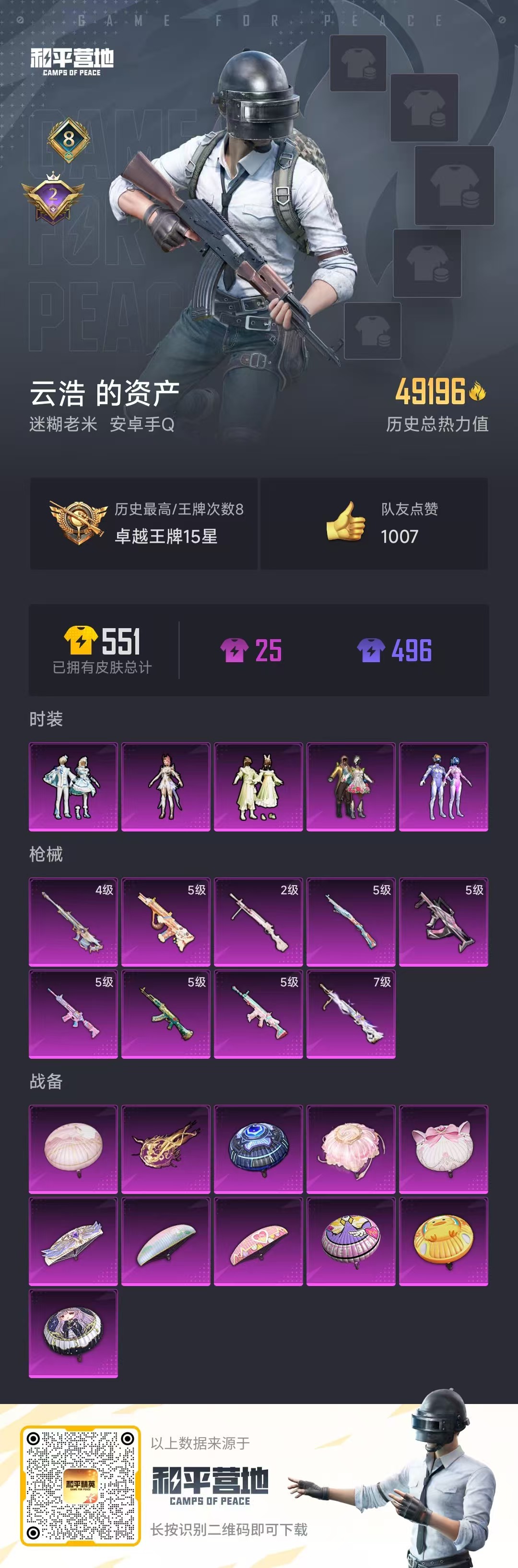 - PX_2095193-时装数: 126 枪械数: 198 战备数: 152 热门装扮: 奇异狩猎者,荒野猎神,宝贝奶油派,鹰眼刺客,东方飞龙,未来领航者 稀有枪皮: 七级AKM-甜心宝贝,六级M416-心之恋语,二级AKM-星际浪客,五级M416-电玩时刻,五级UMP45-量子极限,五级GROZA-镜光银凌,五级Kar98K-巳巳如意,五级AUG-暖羊咩咩,