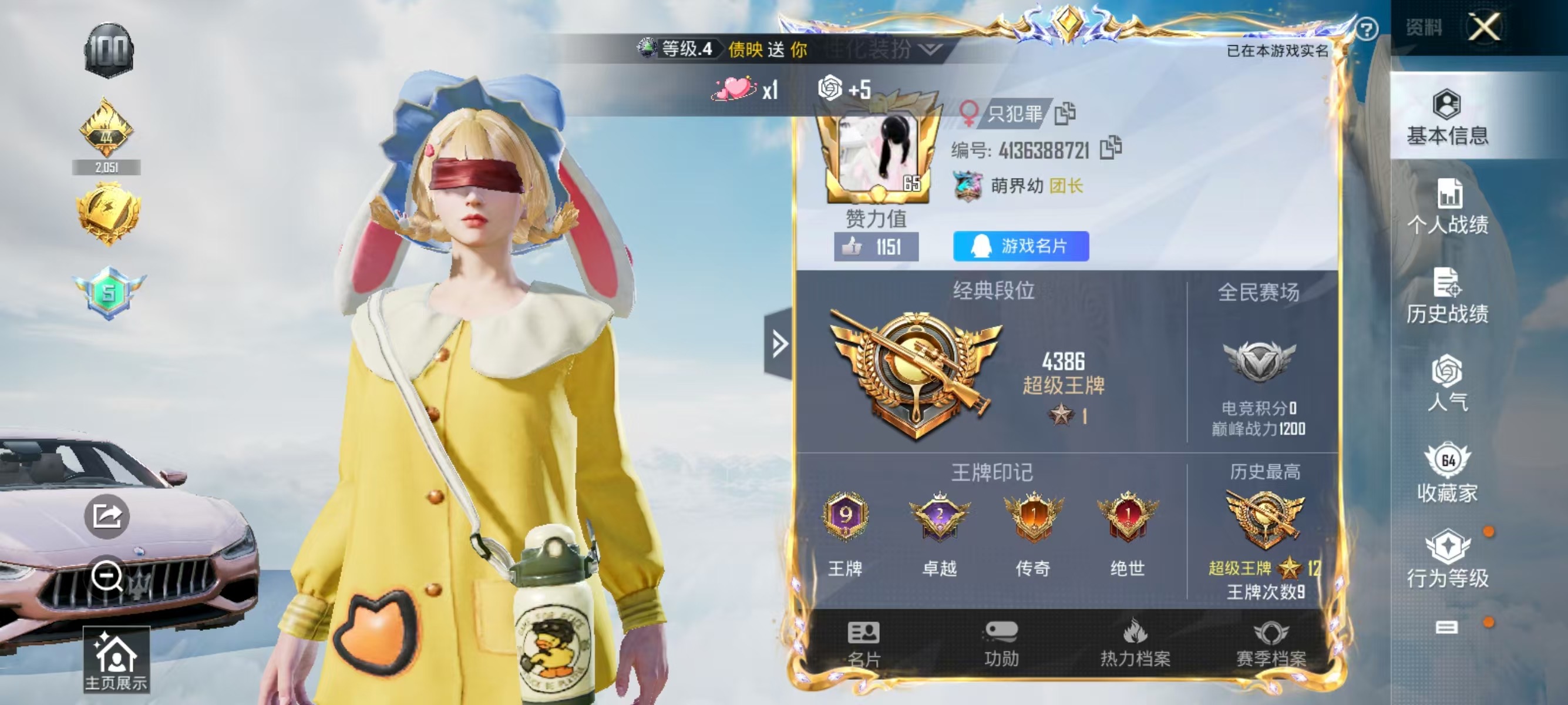 [11136025]实名: 可修改 时装数: 480 载具数: 2 枪械数: 176 战备数: 121 热门装扮: 梦幻火箭(新101),蝶舞迷情,呆萌铁蟹,宝贝奶油派,天使彩虹糖,炙焰红王,冰霜白皇,蜜桃特工,旋转彩虹,冰川粉黛,冰川红玫,冰川幽秘,潮萌小黄鸭,兔兔白日梦,仲夏莫吉托,第五大道,星穹咏叹调 载具: 玛莎拉蒂Ghibli(粉),双人摩托-梦幻火箭 稀有枪皮: AKM炫紫旋律,AWM花间之火,M416心之恋语,SCAR-L童趣迷兔,UMP45相思残雪,M249彩虹甜喵,M417第五大道,P90粉樱探戈,AUG超新星,M249猪猪侠,Kar98K-巳巳如意,DP-28-豹影疾电