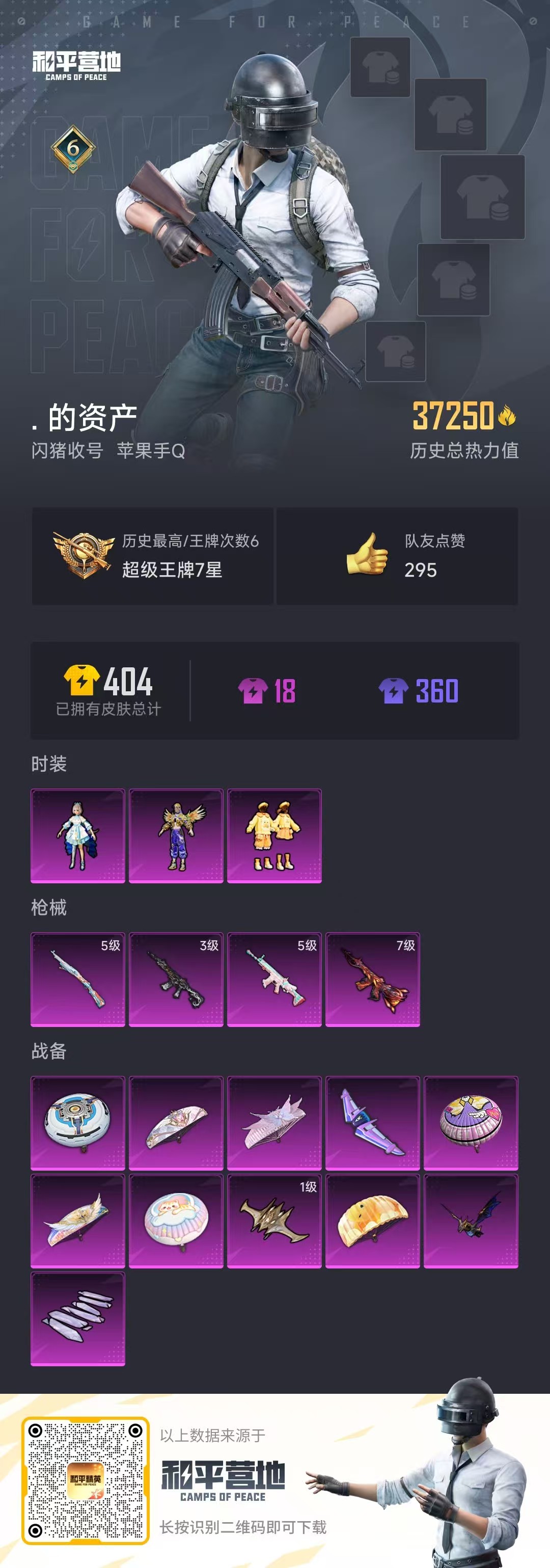 [11228405]实名: 可修改 时装数: 319 枪械数: 119 战备数: 65 热门装扮: 洛天依,憨憨奶龙,光极星 稀有枪皮: M416风花雪月,SCAR-L-锦绣绵绵,M416墨龙九天,Kar98K-巳巳如意