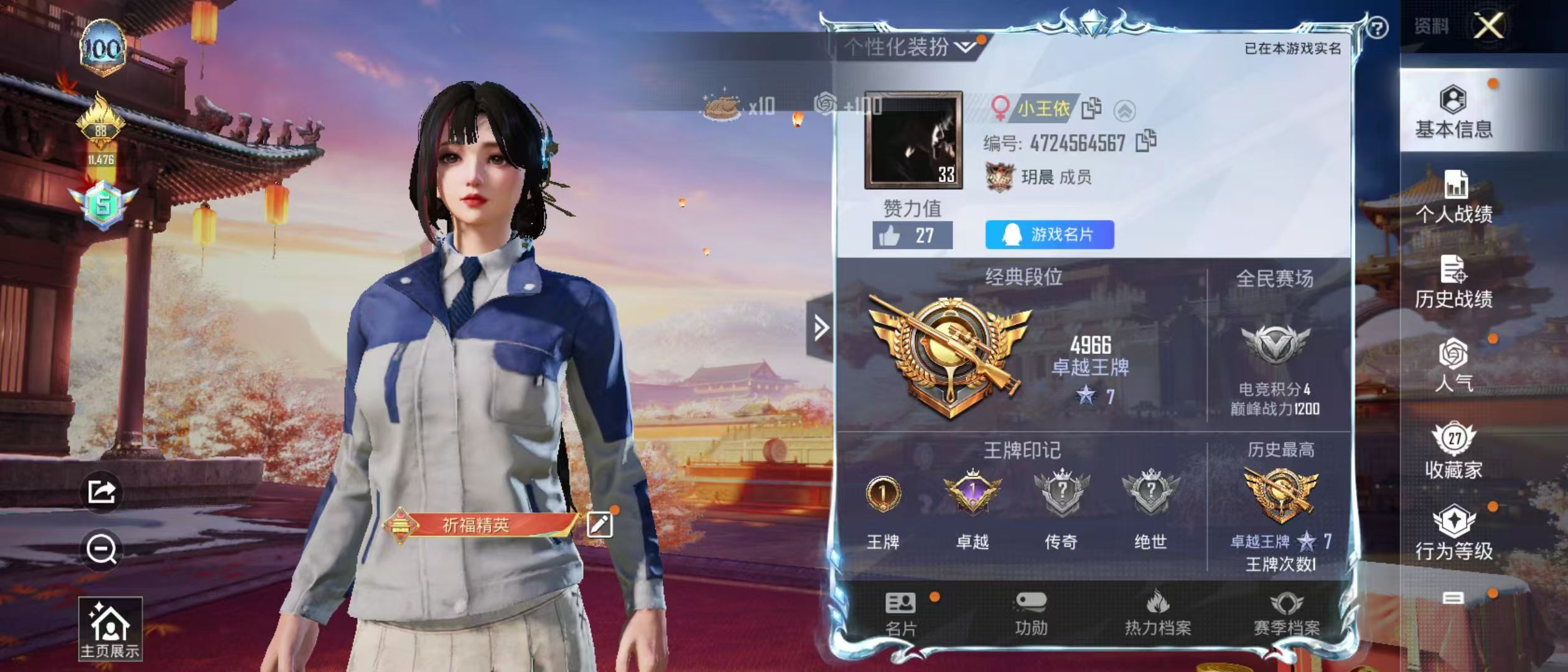 [5966416]实名: 可修改 时装数: 75 载具数: 1 枪械数: 34 战备数: 37 神级装扮: 墨龙九天-敖渊 热门装扮: 时空协奏·心弦,女娲灵识 载具: 护世瑞兽 稀有枪皮: P90沙丘之主,M24镜域双华,Kar98K-巳巳如意,SCAR-L金蛇镇世