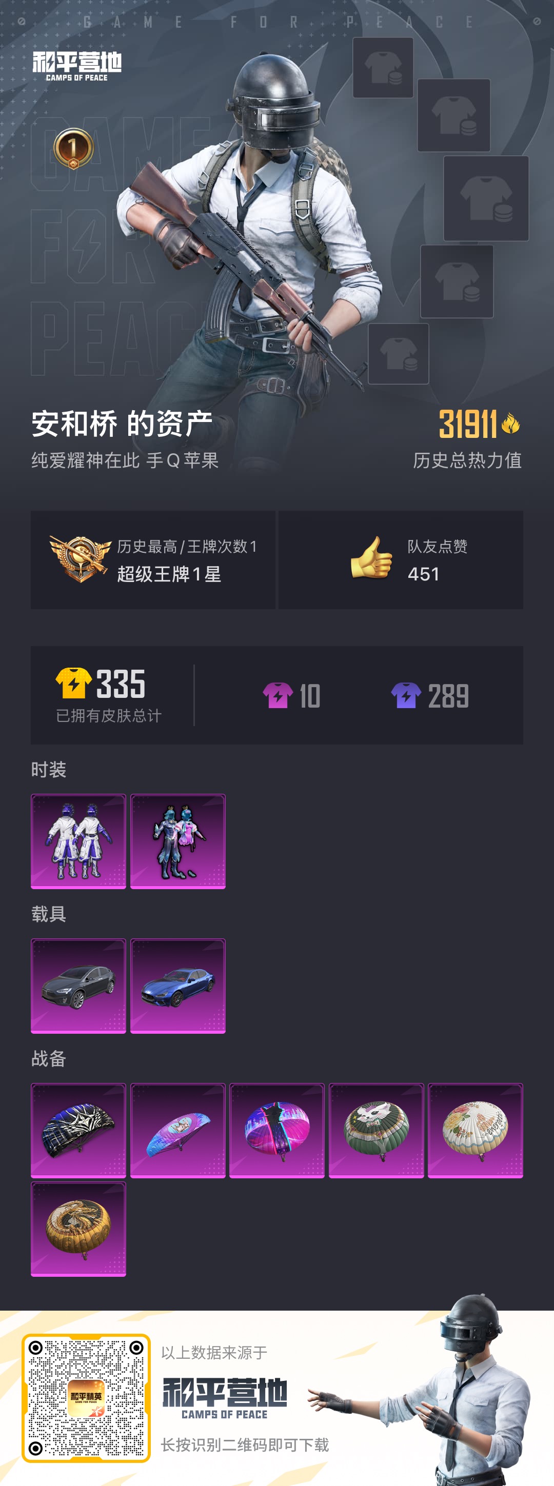 [10849436]实名: 可修改 时装数: 296 载具数: 2 枪械数: 103 战备数: 64 热门装扮: 深海曼妙,新星烈龙,软萌银虎 载具: 玛莎拉蒂Ghibli(蓝),特斯拉Model X(冷光银)