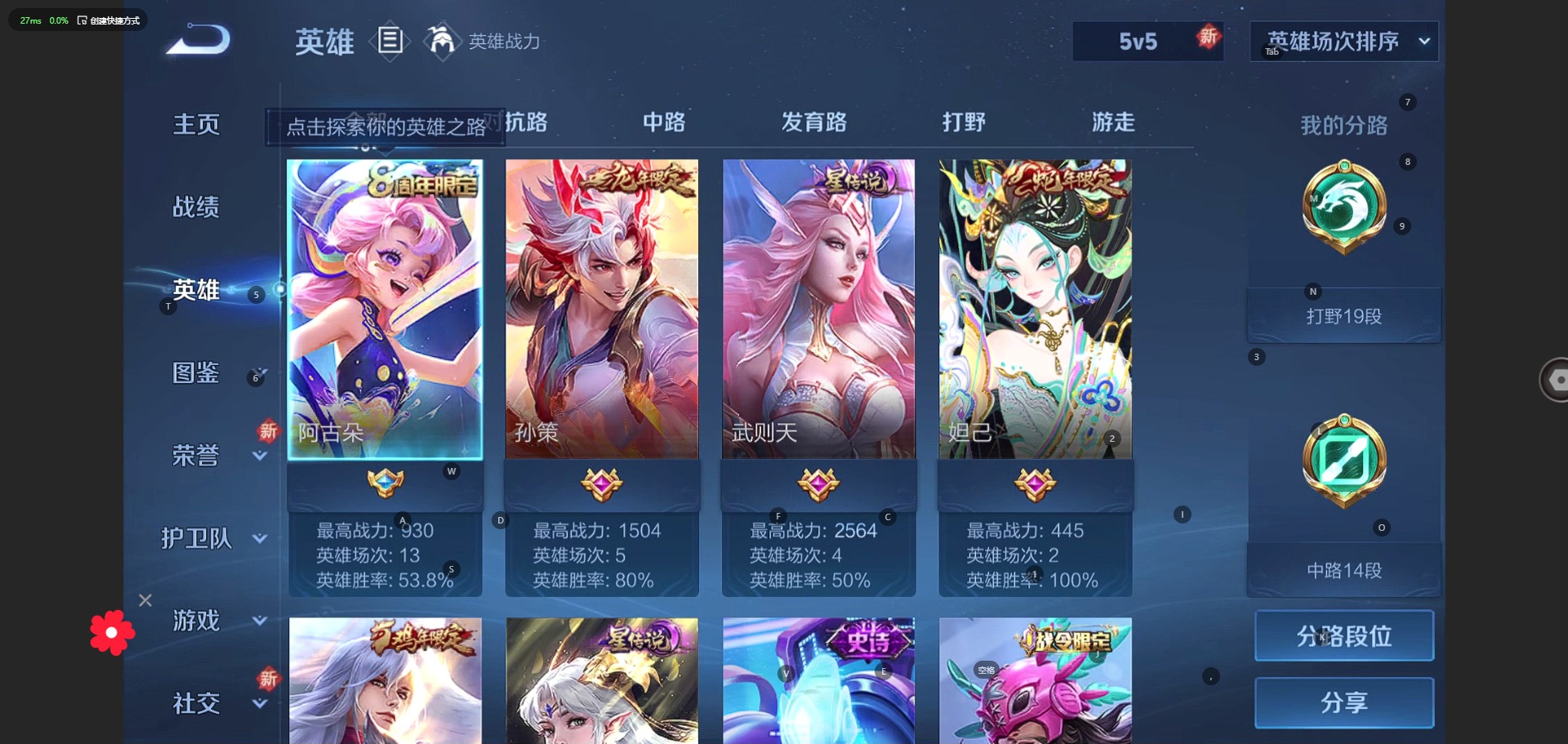 - PX_2057203-贵族等级: V8 英雄数: 124 皮肤数: 286 荣耀水晶: 全息碎影,幻阙歌 星传说: 未来机甲,金色仲夏夜 传说皮: 黄金射手座,冠军飞将,久胜战神,炽阳神光,末日机甲-孙尚香,地狱火,仲夏夜之梦,地狱之眼,超时空战士-狄仁杰,碎云,山海·苍雷引 限定皮: 遇见飞天,李小龙,游园惊梦,梁祝,引擎之心,神威,蜜橘之夏,飞衡,天狼绘梦者,白虎志,青龙志,至尊宝,武陵仙君,