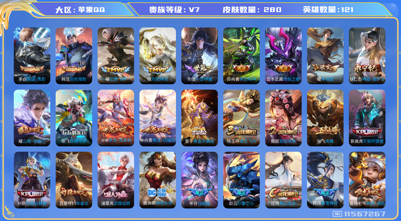 [11567267]【商品标题】:苹果Q-V7-至尊星耀IV段位-121英雄-279皮肤-2典藏-0珍品无双-0无双-0珍品传说-21传说-87史诗