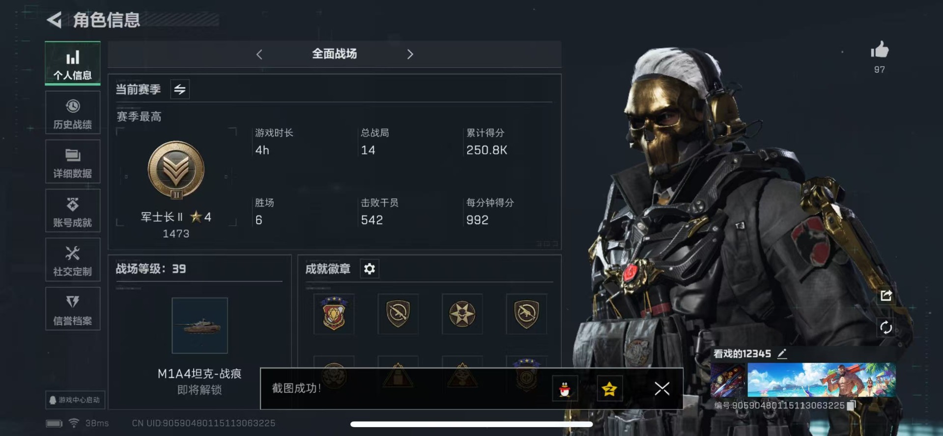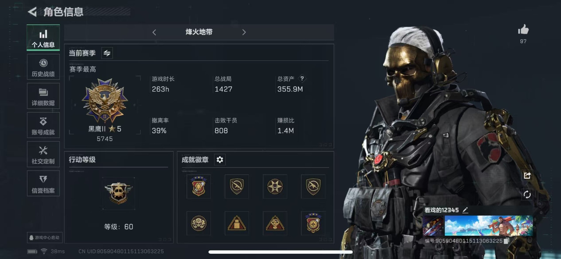 [11567917]总资产:355.9M 8干员外观 3近战传说 37传说枪械 哈夫币:100K 可二次 可修改实名 优质装备:近战-影锋,近战-赤枭,近战-北极星,K416突击步枪-命运(典藏),腾龙突击步枪-气象感应(典藏),Vector冲锋枪-美杜莎,QBZ95-1突击步枪-王牌之剑(典藏),顶级安全箱(3x3) 烽火地带段位:黑鹰 全面战场段位:军士长 传说武器皮肤:SR-25射手步枪-水墨云图,SCAR-H战斗步枪-水墨云图,AS Val突击步枪-蛇年祥瑞,M1014霰弹枪-影锋,AWM狙击步枪-影锋,SCAR-H战斗步枪-铁艺苍穹,SMG45冲锋枪-骑士,G18-飞虎,UZI冲锋枪-特斯拉线圈,M16A4突击步枪-狩猎时刻,AK-12突击步枪-特斯拉线圈,SR-3M紧凑突击步枪-特斯拉线圈,勇士冲锋枪-能天使-午夜邮差,Vector冲锋枪-狩猎时刻,G3战斗步枪-狩猎时刻,复合弓-黑-天际线,K437突击步枪-北极星,QCQ171冲锋枪-北极星,725双管霰弹枪-送葬人-无题密令,M4A1突击步枪-阿米娅,CAR-15突击步枪-阿米娅,AK-12突击步枪-夜鹰,M7战斗步枪-维京,AKM突击步枪-赤枭,QBZ95-1突击步枪-破军,M249轻机枪-赤枭,AKM突击步枪-零度协议,M700狙击步枪-零度协议,M7战斗步枪-零度协议,P90冲锋枪-深海 史诗武器皮肤:Vector冲锋枪-潜袭者,M1014霰弹枪-暗鸦,K437突击步枪-私人定制(典藏),勇士冲锋枪-私人定制(典藏),AK-12突击步枪-原型机(典藏),SR-3M紧凑突击步枪-英雄,PTR-32战斗步枪-ACE,QBZ95-1突击步枪-ACE,Vector冲锋枪-红色彗星,AUG突击步枪-特勤执行,SKS射手步枪-ACE,PKM通用机枪-蝮蛇,M700狙击步枪-蝮蛇,SG552突击步枪-尖端治疗,AS Val突击步枪-尖端治疗,M700狙击步枪-守夜人,Ash-12战斗步枪-守夜人,SR-25射手步枪-尖端治疗,勇士冲锋枪-深海恐惧,AKM突击步枪-林中猎手,M16A4突击步枪-竞赛选手,M250通用机枪-囚徒,SV-98狙击步枪-林中猎手,PTR-32突击步枪-英雄,SV-98狙击步枪-囚徒,SCAR-H战斗步枪-囚徒,腾龙突击步枪-无垢,MP7冲锋枪-无垢,PSG-1射手步枪-无垢,PKM通用机枪-荒野求生,