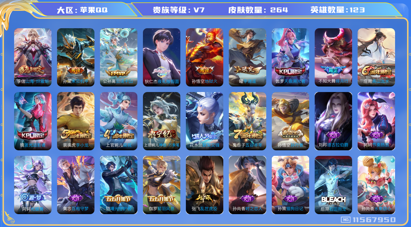 [11567950]V7 7传说 123英雄 264皮肤 可修改实名 优质装备:地狱火,李逍遥,末日机甲-孙策,山海·炽霜斩(李信年限),夜礼服假面 传说皮:云诺千山 珍宝阁皮:蔷薇恋人,女武神 限定皮:绯月行,高山流水,五谷丰年,梁祝,天狼溯光者,李小龙,默契交锋-花木兰,孙行者,匿光追影者,神器·万象笔 史诗皮:鸭鸭历险记-刘禅,化蝶舞,龙之律动,石田雨龙,百相守梦-周瑜,百相守梦-黄忠,紫霞仙子,黄金分割率,特工魅影,千年之狐,永昼,魅语,蒙恬荣光圣徽,无限星赏官,晚萤,末日机甲-吕布,猫狗日记-孙策,时之恋人-孙尚香,乱世虎臣,节奏热浪,修罗,水果甜心,绅士熊喵,星夜王子,功夫厨神,德古拉伯爵,暗隐猎兽者,鬼剑武藏,拒霜思,逐浪之夏,水晶猎龙者,曙光守护者,箭羽风息,金属风暴,原初追逐者,圣诞恋歌,鹰眼统帅,黎明之约,赏金猎手,无心,未来纪元-赵云
