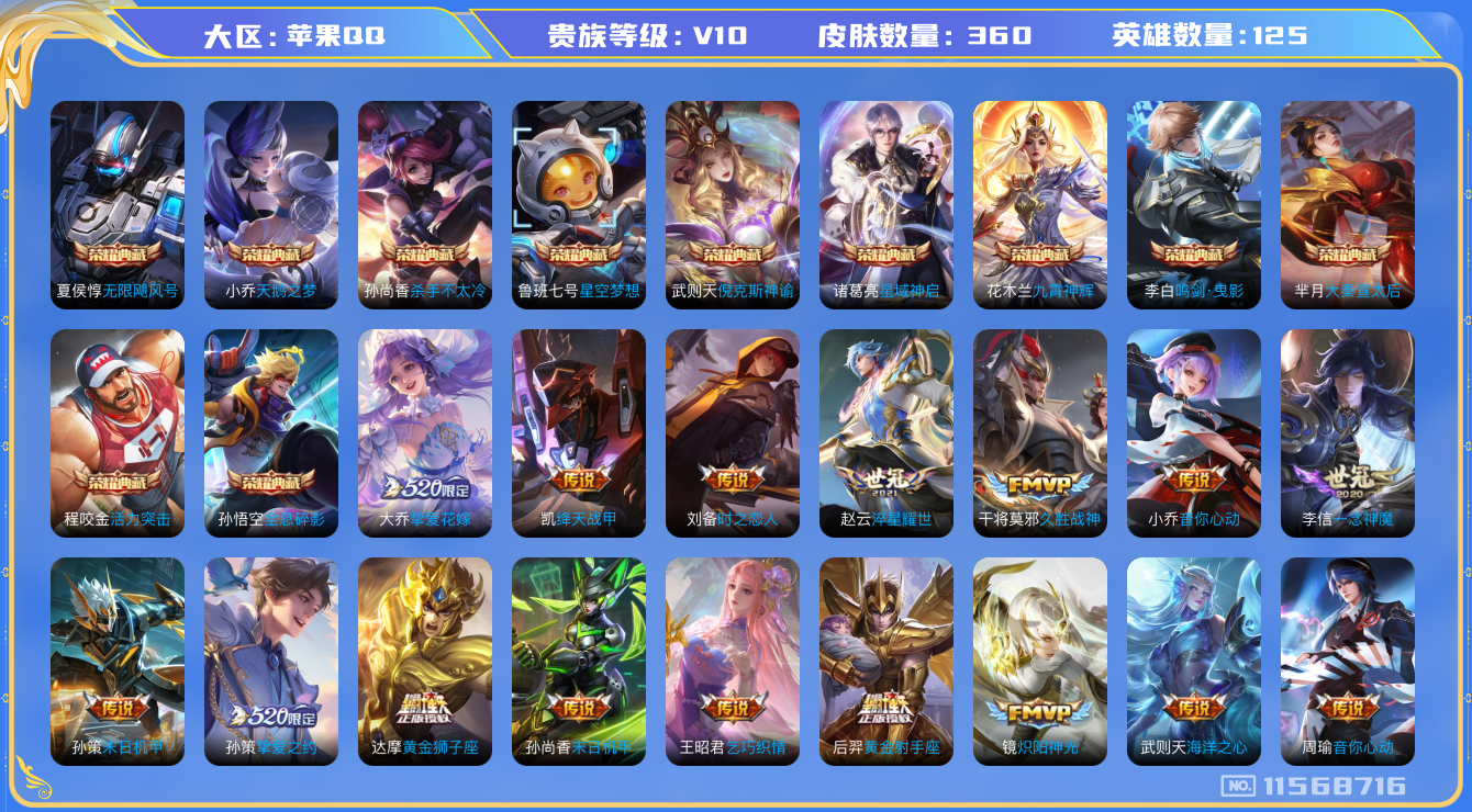 [11568716]V10 11典藏 43传说 125英雄 360皮肤 典藏英雄武则天 女号 可修改实名 优质装备:天鹅之梦(小乔典藏),星空梦想(太空人),倪克斯神谕(宇宙婆娘),无限飓风号(高达),活力突击,杀手不太冷,大秦宣太后,鸣剑·曳影,全息碎影(猴子典藏),星域神启(倪克斯贼亮),九霄神辉(木兰典藏),黄金狮子座,黄金射手座,冠军飞将,云鹰飞将(小将军),绛天战甲(鸡嘴战神),黄金白羊座,猫影幻舞,久胜战神,炽阳神光,一念神魔,云霓雀翎,末日机甲-孙尚香(绿蚂蚱),地狱火,仲夏夜之梦(大飞蛾),音你心动-小乔,零号·赤焰,海洋之心,地狱之眼,飞鸢探春,音你心动-周瑜,胖达荣荣,李逍遥,乞巧织情,时之恋人-刘备(电焊工),游龙清影(小青龙),淬星耀世,超时空战士-狄仁杰,末日机甲-孙策,花朝如约(花篮子),挚爱之约,挚爱花嫁,无双飞将,艾琳觅芳踪 珍宝阁皮:蔷薇恋人 限定皮:鸣野蒿,至尊宝,白虎志(电光耗子),凤求凰(白切鸡),武陵仙君(小桃花),异界灵契(白毛香),傲雪梅枪,补天,魔法小厨娘,神威(电光马子),遇见飞天,高山流水,匿光决锋者,青龙志(铠年限),冰锋战神,武圣,梁祝,天狼绘梦者,李小龙,朱雀志(守约年限),霸王别姬-项羽,霸王别姬-虞姬,孙行者,一生所爱,大圣娶亲,青春决赛季,匿光追影者,寅虎·赤拳(老虎年限),百木心枪,玉兔公主,启示之音 史诗皮:遇见神鹿,紫霞仙子,电玩小子(小书包),白龙吟,黄金分割率,特工魅影,千年之狐,永昼,魅语,蒙恬荣光圣徽,无限星赏官,冰冠公主,青蛇,偶像歌手,白蛇,晚萤,电玩·兔顽号,暗夜猫娘,龙骑士(小龙虾),末日机甲-吕布,猫狗日记-孙策,猫狗日记-大乔,时之恋人-孙尚香,乱世虎臣,节奏热浪,修罗,女仆咖啡,摇滚巨星,水果甜心,绅士熊喵,天才门将,星夜王子,心灵骇客,时之奇旅-安琪拉,功夫厨神,德古拉伯爵,暗隐猎兽者,幽灵船长,鬼剑武藏,暗渊魔法,心灵战警,乐园奇幻夜,天秀·启明,舞动绿茵,地狱岩魂,诗语江南,纤云弄巧,繁星吟游(呼啦呼啦),缤纷独角兽,乘风破浪,逐浪之夏,龙鼓争鸣,月团寄思,水晶猎龙者,曙光守护者,热力回旋,箭羽风息,唤灵魅影,金属风暴,原初追逐者,圣诞狂欢,圣诞恋歌,鹰眼统帅,暗夜贵公子,魅力维加斯,黎明之约,雪上飞焰,赏金猎手,奇遇舞章,天秀·音浪,千筹问战,未来纪元-赵云