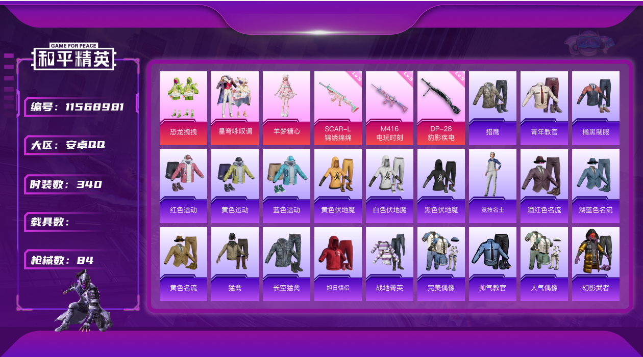 [11568981]3粉装 3特效枪 5印记 可二次 可修改实名 优质装备:SCAR-L-锦绣绵绵,M416电玩时刻,星穹咏叹调,羊梦糖心 热门装扮:恐龙拽拽 稀有枪皮:DP-28-豹影疾电 五级特效枪:五级DP-28-豹影疾电,五级M416-电玩时刻,五级SCAR-L-锦绣绵绵 紫色装扮:SS31特训套装,人气偶像,冰川特警,北国孤狼,霓虹热舞,旭日情侣,云朵鹅,彩虹兔,雪绒豹,SS33特训套装,顶瓜瓜,乐音,电音精灵,都市魅力,酒红色名流,长空猛禽,霓虹街区,青年教官,缤纷果语,蓝彩潮人,蓝色运动,街头潮人,超能勇士,蓝海鲸歌,无面战甲,魅力单车,黄色伏地魔,黄色名流,黄色运动,黑色伏地魔,龙的传人,龟仙人,柠萌假日,橘黑制服,深蓝色名流,幻影武者,夜莺强袭者,完美偶像,帅气教官,战地菁英,湖蓝色名流,绮丽涂鸦,甜蜜菠萝,疯狂小兔子,白色伏地魔,破蛋小黄鸡,空岛之星,竞技达人朋克,红色运动,猛禽,猎鹰,异域银装,都市丽猫,竞技名士,惊鸿侠骨,SS25特训,锦衣飞扬,焰鹰斗篷,幻羽潜行,SS27特训,萌趣绒叽,忠义严颜,云霞荷露,SS26特训,春光漫游,快闪甜心,贝斯之夜,大橘大利,星影赞美诗,耀粉歌者,SS32特训服(SS32特训套装),绯格组合,白糯汤圆 优质战备:霓虹漫游降落伞,龙行天下降落伞,莲影清波降落伞,萌物绒绒飞行器,猪猪侠降落伞,时光之誓降落伞,幻彩电音降落伞,喜羊羊与灰太狼降落伞