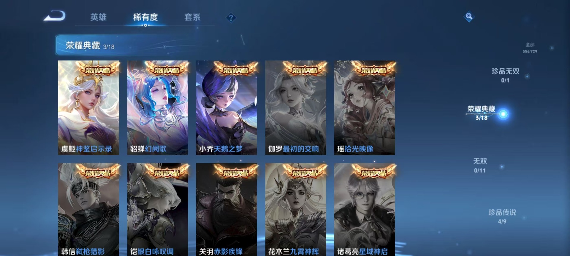 大乔白蛇,大乔猫狗日记,高渐离天秀·音浪,刘邦德古拉伯爵,夏侯惇乘风破浪,阿轲节奏热浪,铠曙光守护者,刘备百相守梦,曹操幽灵船长,廉颇地狱岩魂,伽罗箭羽风息,伽罗琥珀纪元,小乔缤纷独角兽,小乔青蛇,孙策猫狗日记,不知火舞魅语,赵怀真器灵·浮梦炉,鲁班七号电玩小子,项羽苍穹之光,吕布圣诞狂欢,露娜紫霞仙子,吕布末日机甲,诸葛亮黄金分割率,刘禅电玩·爆裂旋风,刘禅天才门将,刘禅绅士熊喵,宫本武藏鬼剑武藏,兰陵王暗隐猎兽者,貂蝉圣诞恋歌,苍狼魂孤将,花木兰水晶猎龙者,李白千年之狐,安琪拉心灵骇客,安琪拉时之奇旅,艾琳奇遇舞章,西施诗语江南,白起星夜王子,亚瑟心灵战警,嬴政摇滚巨星,嬴政暗夜贵公子,程咬金功夫厨神,雅典娜冰冠公主,雅典娜黎明之约,李元芳匿光侦查者,李元芳逐浪之夏,百里守约特工魅影,墨子龙骑士,墨子金属风暴,蔡文姬舞动绿茵,瑶遇见神鹿,王昭君偶像歌手