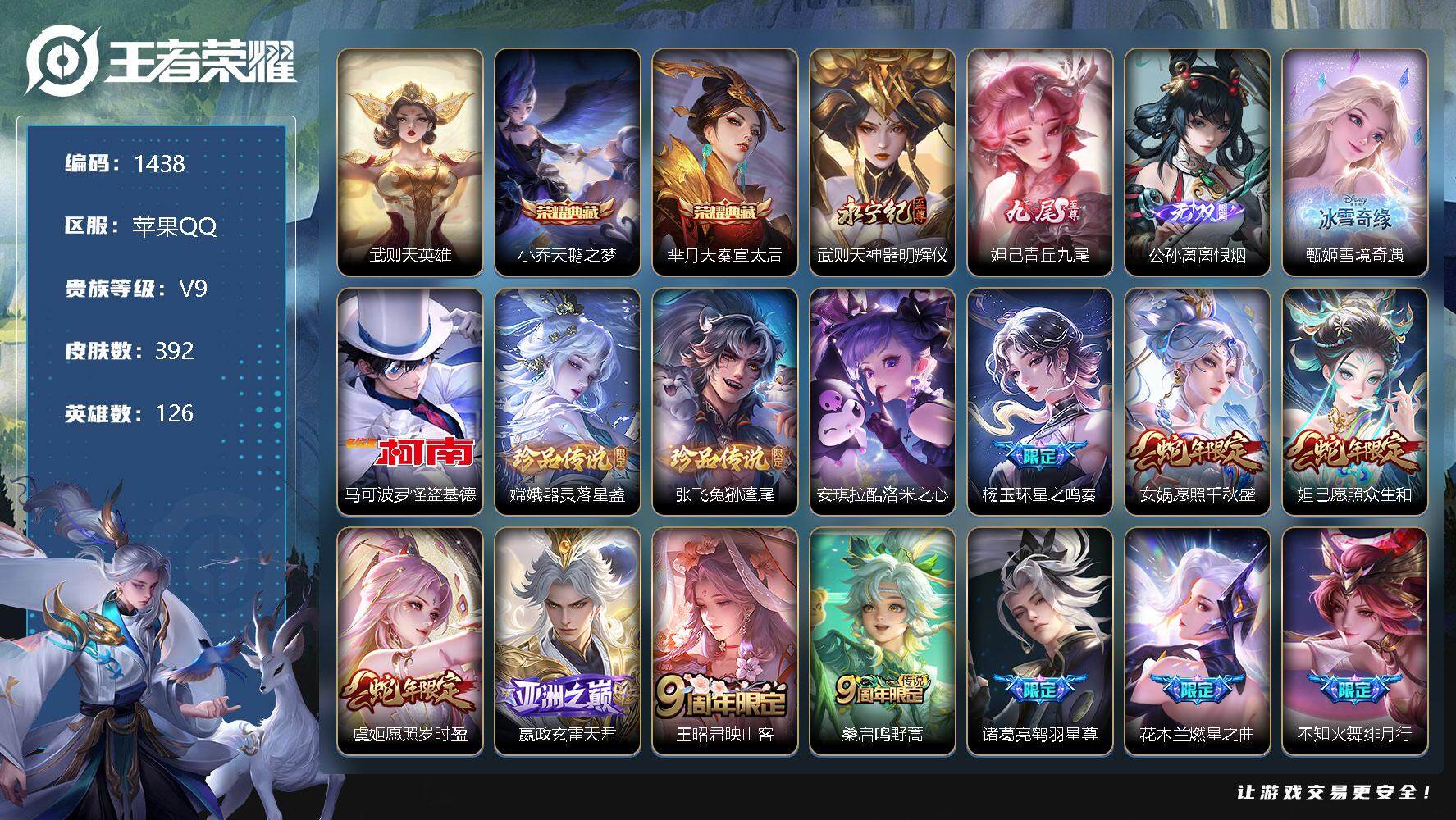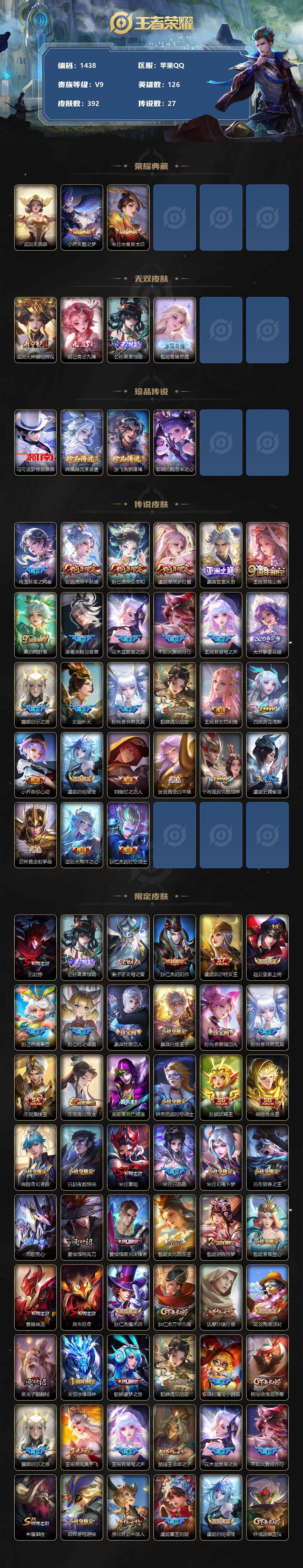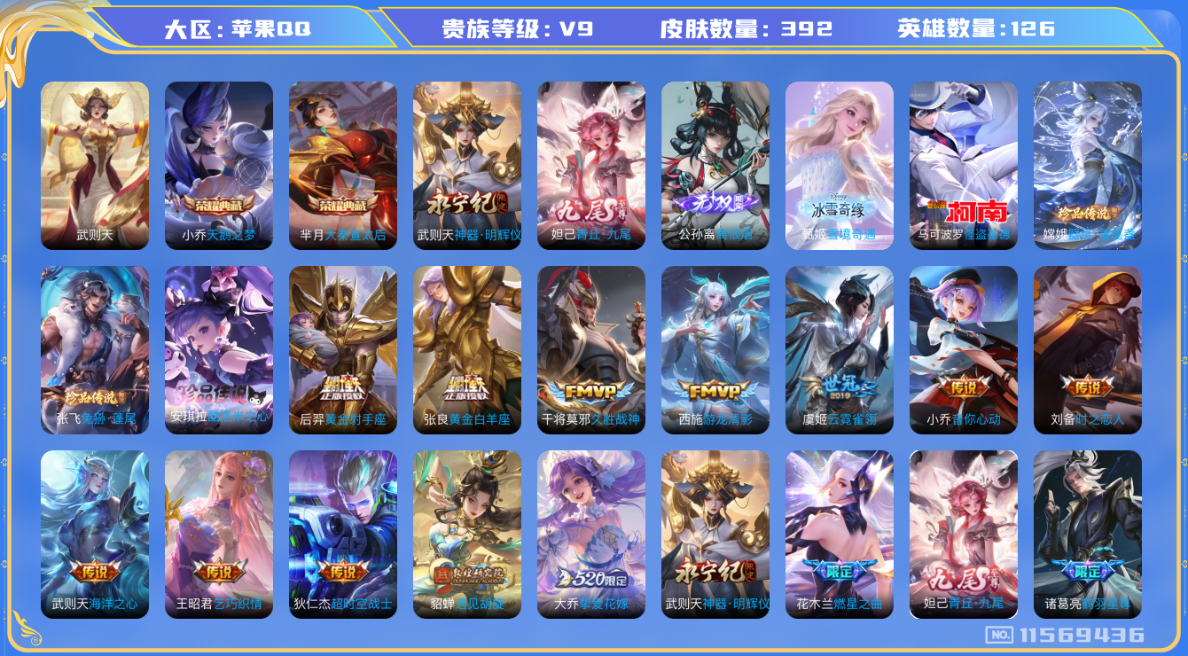 [11569436]【商品标题】:苹果Q-V9-最强王者段位-126英雄-392皮肤-2典藏-0珍品无双-4无双-4珍品传说-27传说-109史诗