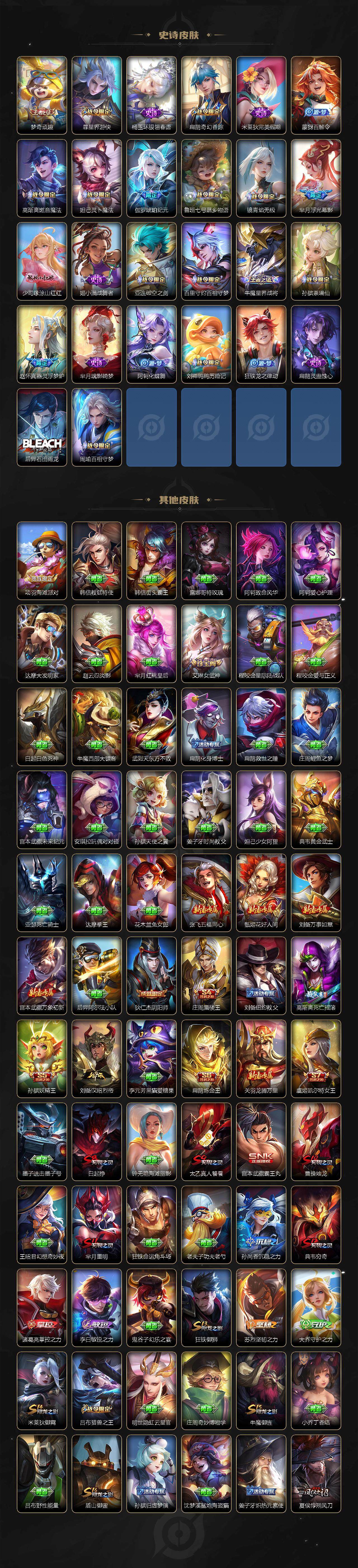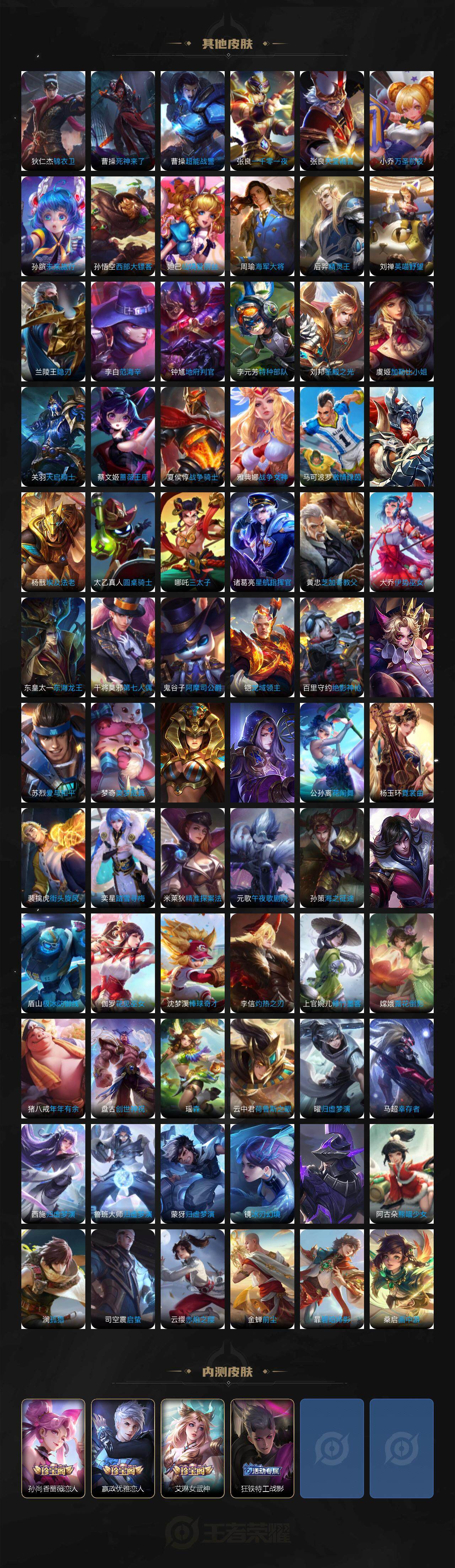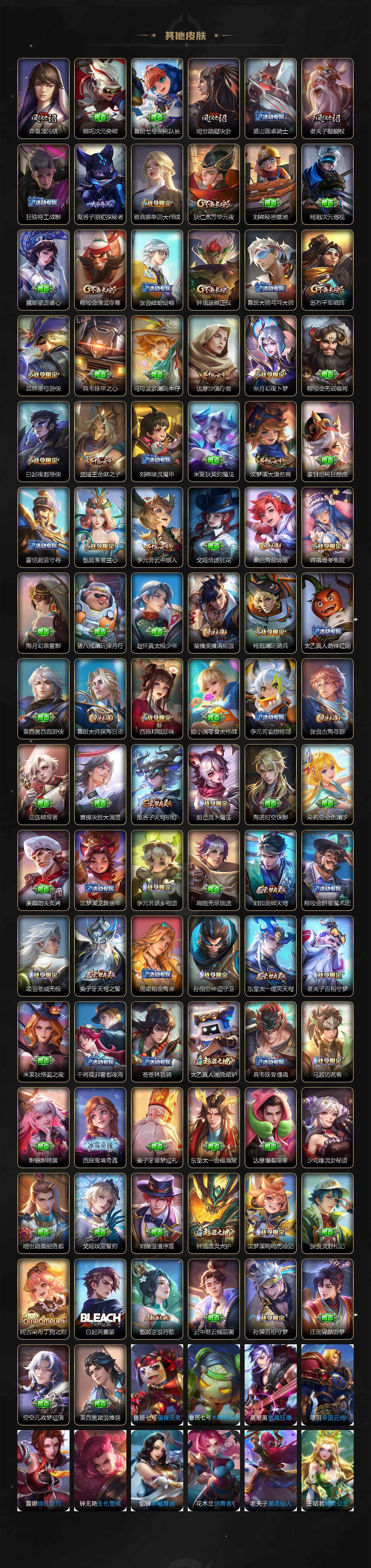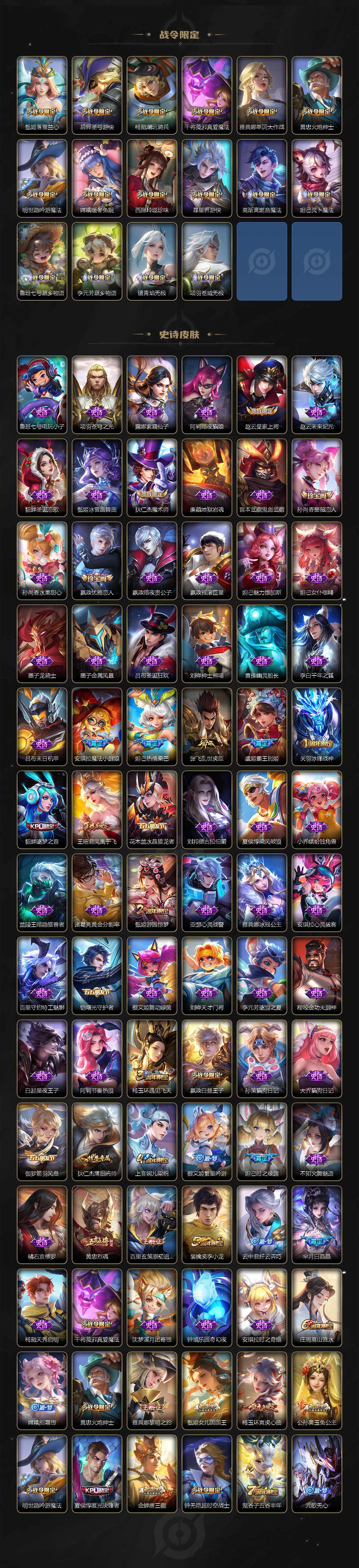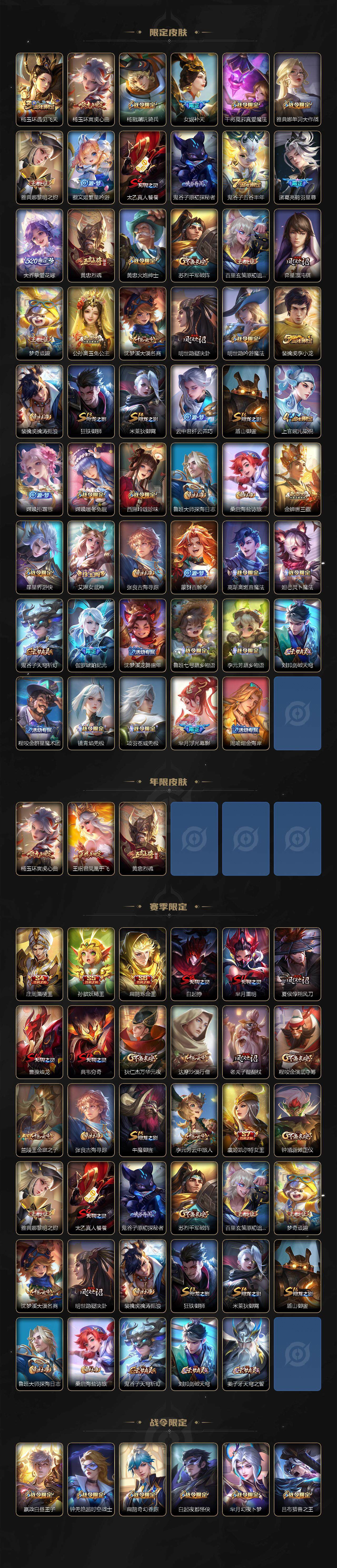 【限定皮肤】:白起狰,公孙离离恨烟,姜子牙天穹之誓,狄仁杰阴阳师,虞姬凯尔特女王,赵云皇家上将,妲己热情桑巴,妲己时之彼端,嬴政优雅恋人,嬴政白昼王子,孙尚香蔷薇恋人,孙尚香异界灵契,庄周蜃楼王,庄周高山流水,高渐离死亡摇滚,钟无艳超时空战士,孙膑妖精王,扁鹊炼金王,扁鹊奇幻香踪,白起夜都怪侠,芈月重明,芈月白晶晶,芈月幻夜卜梦,吕布猎兽之王,元歌无心,夏侯惇朔风刀,夏侯惇匿光决锋者,甄姬女儿国国王,甄姬游园惊梦,甄姬落雪兰心,曹操烛龙,典韦穷奇,狄仁杰魔术师,狄仁杰万华元夜,达摩沙漠行僧,项羽海滩派对,老夫子醍醐杖,关羽冰锋战神,貂蝉逐梦之音,貂蝉遇见胡旋,安琪拉魔法小厨娘,程咬金演武夺筹,露娜启示之音,王昭君凤凰于飞,王昭君星穹之声,兰陵王金庭之子,花木兰燃星之曲,不知火舞绯月行,牛魔御旌,后羿圣弓游侠,李元芳云中旅人,虞姬霸王别姬,虞姬启明星使,钟馗驱傩正仪,杨玉环遇见飞天,杨玉环寅虎心曲,杨戬潮玩骑兵,女娲补天,干将莫邪真爱魔法,雅典娜单词大作战,雅典娜黎明之约,蔡文姬繁星吟游,太乙真人饕餮,鬼谷子原初探秘者,鬼谷子五谷丰年,诸葛亮鹤羽星尊,大乔挚爱花嫁,黄忠烈魂,黄忠火炮绅士,苏烈千军破阵,百里玄策原初追逐者,弈星混沌棋,梦奇顽趣,公孙离玉兔公主,沈梦溪大漠名商,明世隐疑决卦,明世隐吟游魔法,裴擒虎李小龙,裴擒虎擒涛扼浪,狂铁御狮,米莱狄御霄,云中君纤云弄巧,盾山御銮,上官婉儿梁祝,嫦娥拒霜思,嫦娥暖冬兔眠,西
