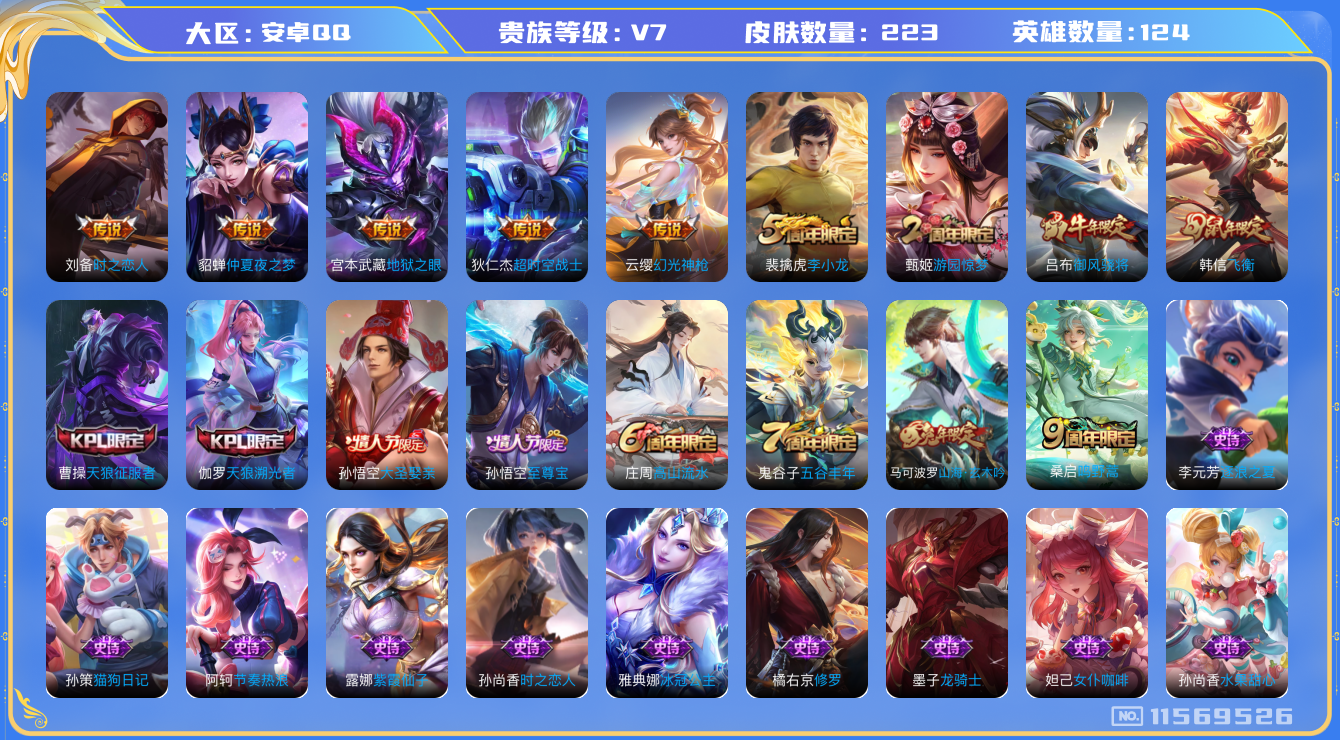 [11569526]【商品标题】:安卓Q-V0-最强王者段位-124英雄-223皮肤-0典藏-0珍品无双-0无双-0珍品传说-6传说-58史诗