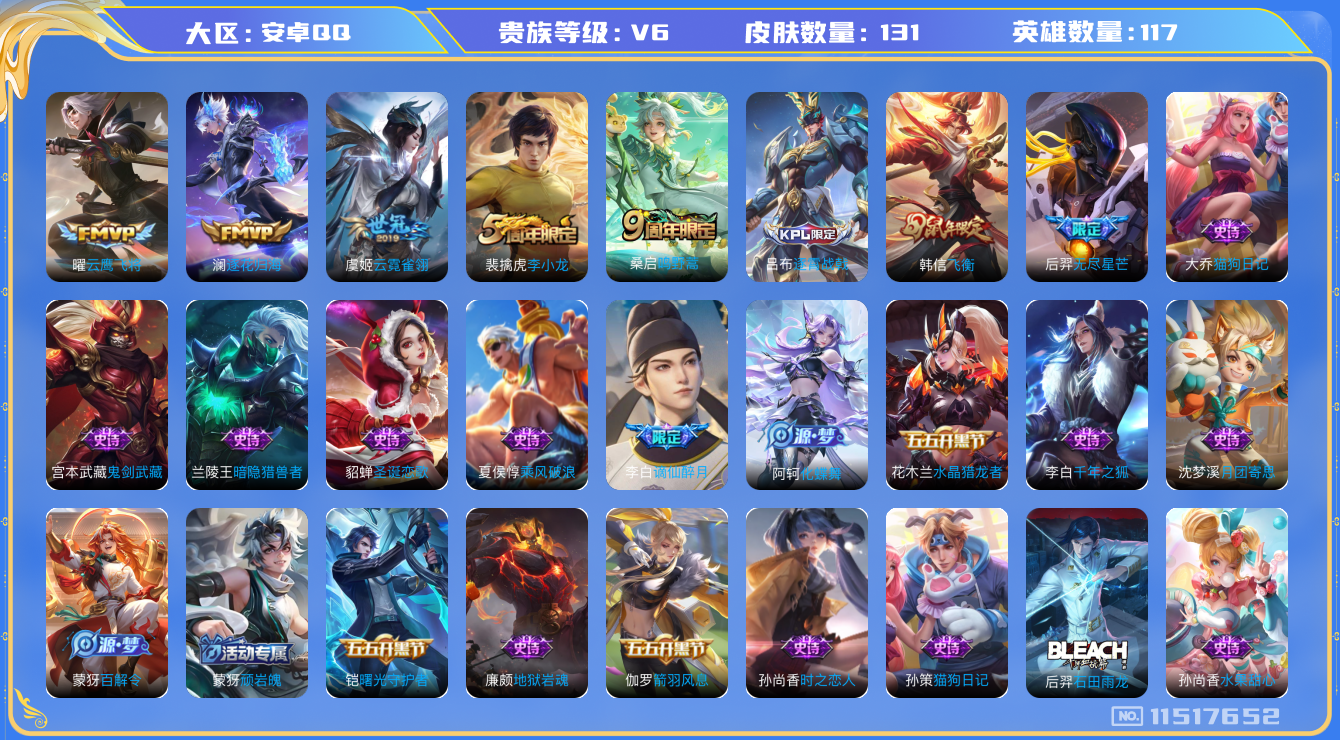 [11517652]V6 5传说 117英雄 131皮肤 可修改实名 优质装备:云鹰飞将(小将军),云霓雀翎,澜逐花归海 珍宝阁皮:妄想食味 限定皮:逐霄战戟,鸣野蒿,飞衡(韩信年限),李小龙,无尽星芒 史诗皮:鸭鸭历险记-刘禅,飞车小橘子,器灵·浮梦炉,化蝶舞,龙之律动,石田雨龙,战舞者,蒙犽顽岩魄,埋骨钱,谪仙醉月,蔬乡物语(鲁班七号),紫霞仙子,特工魅影,千年之狐,江河有灵,百解令(蒙犽),龙骑士(小龙虾),末日机甲-吕布,猫狗日记-孙策,猫狗日记-大乔,时之恋人-孙尚香,水果甜心,天才门将,暗隐猎兽者,鬼剑武藏,乐园奇幻夜,地狱岩魂,拒霜思,乘风破浪,逐浪之夏,月团寄思,水晶猎龙者,曙光守护者,箭羽风息,圣诞恋歌,赏金猎手