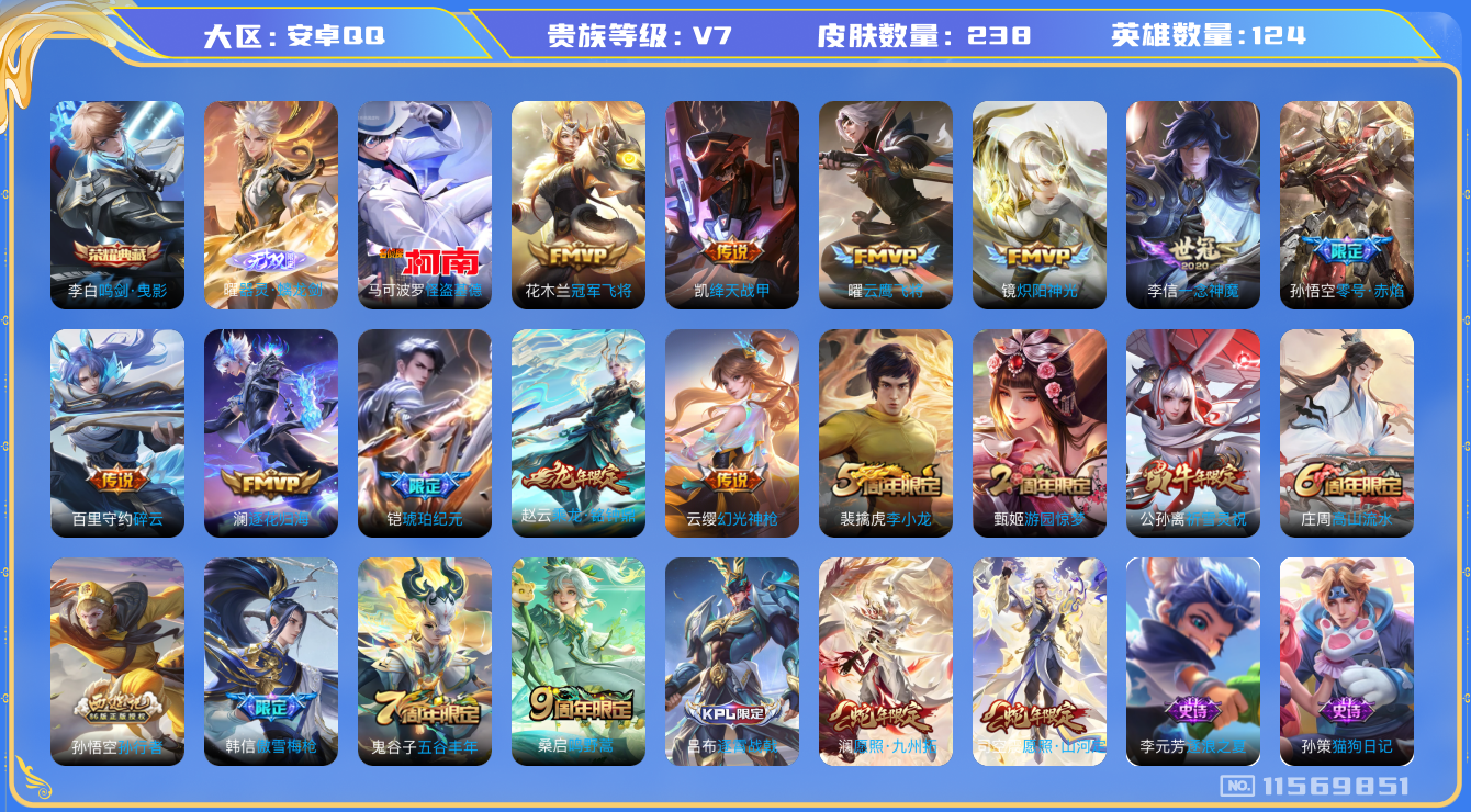 [11569851]【商品标题】:安卓Q-V7-最强王者段位-124英雄-238皮肤-1典藏-0珍品无双-1无双-1珍品传说-15传说-73史诗