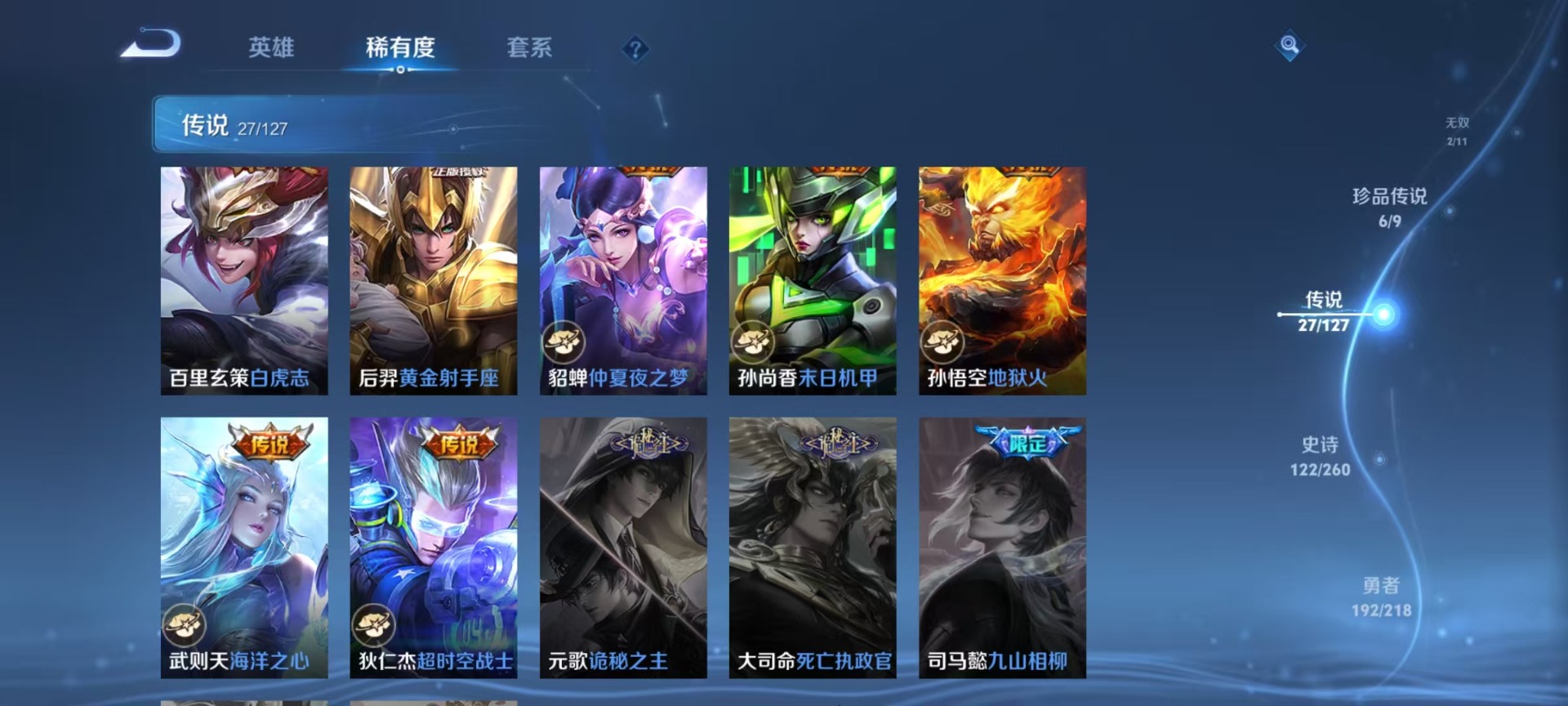 甄姬女儿国国王,曹操天狼征服者,伽罗太华,孙膑天狼运算者,干将莫邪冰霜恋舞曲,后羿如梦令,后羿辉光之辰,诸葛亮时雨天司,公孙离祈雪灵祝,司空震愿照·山河定,公孙离蜜橘之夏,貂蝉逐梦之音,裴擒虎李小龙,上官婉儿天狼绘梦者,花木兰青春决赛季,桑启鸣野蒿,猪八戒猪悟能,女娲愿照·千秋盛,孙悟空大圣娶亲,百里玄策白虎志,马超神威,雅典娜神奇女侠,盘古冰霜神祇,妲己时之彼端,妲己愿照·众生和,韩信逐梦之影,百里守约朱雀志,蔡文姬愿照·福禄聚,瑶时之祈愿,澜愿照·九州拓,虞姬愿照·岁时盈,嫦娥如梦令,关羽冰锋战神