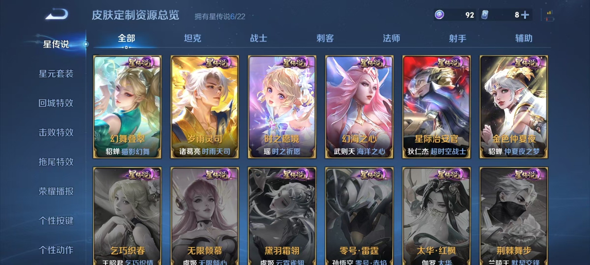 大乔白蛇,大乔猫狗日记,刘邦德古拉伯爵,夏侯惇乘风破浪,阿轲暗夜猫娘,阿轲节奏热浪,铠曙光守护者,曹操幽灵船长,廉颇地狱岩魂,伽罗箭羽风息,小乔缤纷独角兽,小乔青蛇,孙尚香时之恋人,孙策猫狗日记,不知火舞魅语,赵怀真器灵·浮梦炉,鲁班七号电玩小子,项羽苍穹之光,吕布圣诞狂欢,吕布末日机甲,露娜紫霞仙子,周瑜雪夜绮愿,诸葛亮黄金分割率,刘禅电玩·爆裂旋风,刘禅天才门将,刘禅绅士熊喵,宫本武藏鬼剑武藏,公孙离无限星赏官,兰陵王暗隐猎兽者,貂蝉圣诞恋歌,花木兰水晶猎龙者,李白千年之狐,安琪拉心灵骇客,艾琳奇遇舞章,杨戬天秀·启明,西施诗语江南,白起星夜王子,亚瑟心灵战警,嬴政摇滚巨星,嬴政暗夜贵公子,程咬金功夫厨神,百里玄策原初追逐者,雅典娜冰冠公主,雅典娜黎明之约,百里守约特工魅影,李元芳逐浪之夏,墨子龙骑士,墨子金属风暴,蔡文姬舞动绿茵,瑶遇见神鹿,澜赏金猎手,娜可露露晚萤,王昭君偶像歌手,嫦娥拒霜思,橘右京修罗