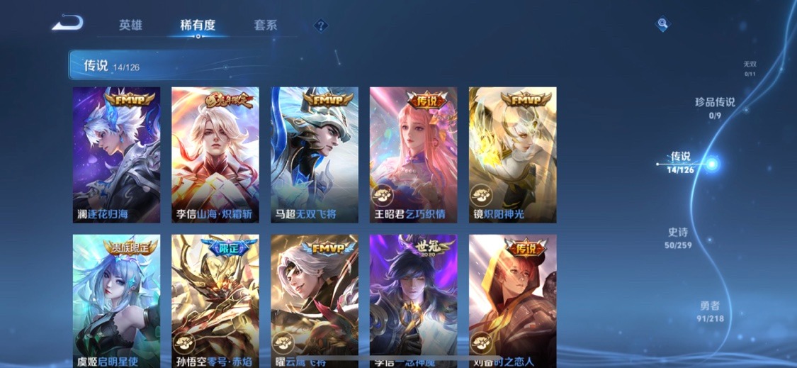 - PX_2106446-Q/非凡王者/176皮肤/125英雄/0典藏/0珍品无双/0无双/0珍品传说/6传说/50史诗/9稀有英雄 【6 传说皮肤】逐花归海 澜,无双飞将 马超,祈雪灵祝 公孙离,炽阳神光 镜,愿照·九州拓 澜,鸣野蒿 桑启, 【50 史诗皮肤】百解令 蒙犽,匿光追影者 镜,暗渊魔法 司马懿,妄想食味 姬小满,德古拉伯爵 刘邦,山海·玄木吟 马可波罗,五谷丰年 鬼谷子,鬼剑武藏 宫本