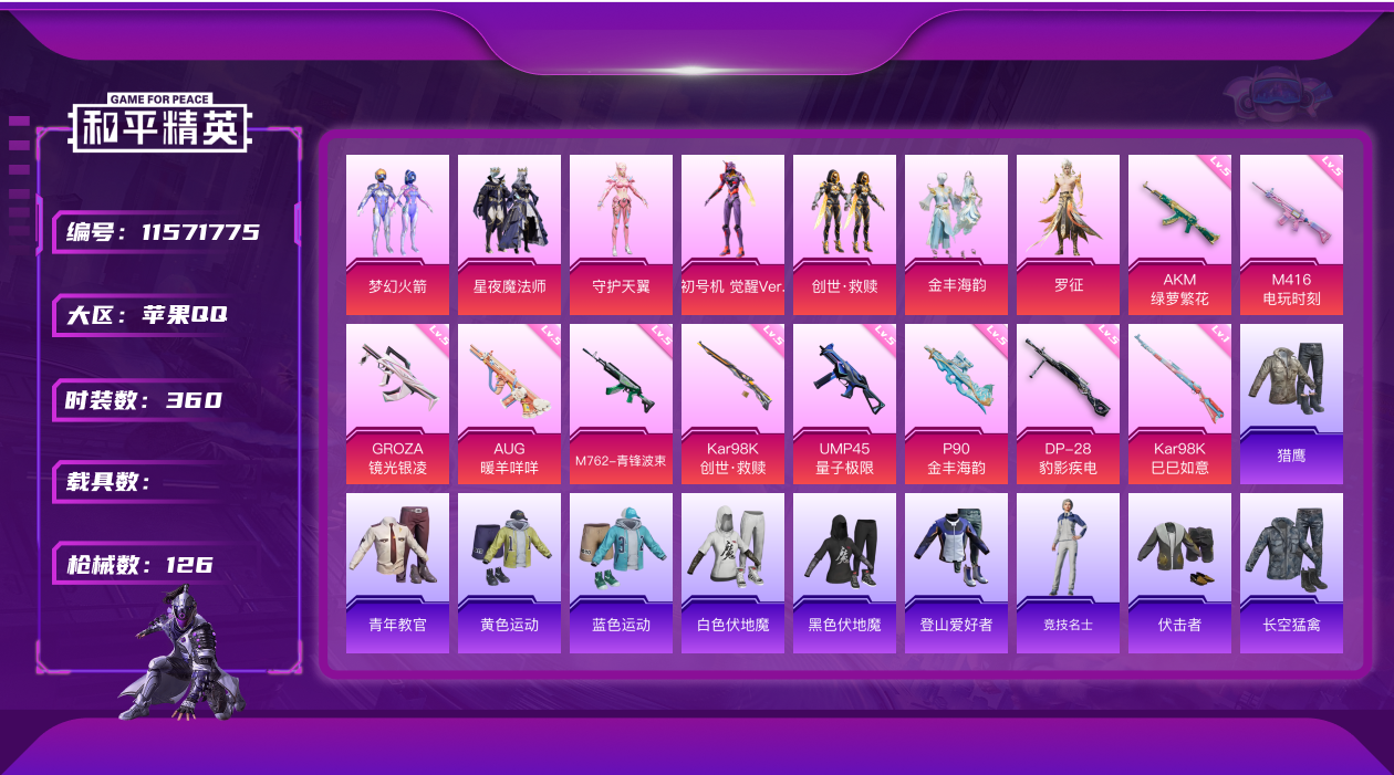 [11571775]7粉装 10特效枪 2印记 可二次 可修改实名 身法装备:初号机 觉醒Ver.(新紫螳螂),8号机(新粉螳螂),Mark.06(新蓝螳螂) 优质装备:梦幻火箭(新101)(新火箭少女101粉色套装),AKM绿萝繁花,M416电玩时刻,Kar98K创世·救赎,UMP45量子极限,P90-金丰海韵,M762-青锋波束,GROZA-镜光银凌,AUG-暖羊咩咩,罗征,Kar98K-巳巳如意 热门装扮:星夜魔法师,创世·救赎,守护天翼,初号机 觉醒Ver.(新紫螳螂),金丰海韵 稀有枪皮:DP-28-豹影疾电 五级特效枪:五级M762-青锋波束,五级P90-金丰海韵,五级UMP45-量子极限,五级GROZA-镜光银凌,五级Kar98K-创世·救赎,五级DP-28-豹影疾电,五级AUG-暖羊咩咩,五级M416-电玩时刻,五级AKM-绿萝繁花 一级特效枪:一级Kar98K-巳巳如意 紫色装扮:SS23特训,SS31特训套装,SS5特训,伏击者,冰原使者,,冷焰舞者,凛冬战士,北国孤狼,旭日情侣,SS30特训套装,云朵鹅,彩虹兔,雪绒豹,SS33特训套装,都市漫游者,酷潮明星,金鼠迎春,长空猛禽,雪山征服者,雪山精英,霓虹街区,青年教官,缤纷果语,蓝色运动,跃动心情,魅力单车,黄色运动,黑色伏地魔,龙的传人,龟仙人,蝶变,柠萌假日,圣诞大吉,战地菁英,绮丽涂鸦,疯狂小兔子,登山爱好者,白色伏地魔,甜蜜告白,空岛之星,竞技勇士朋克,牛气冲天,灰色格斗者,热血青春,猎鹰,粉日山川,雏菊兔兔,萝兰蝴蝶,SS29特训,湖畔霞光,创世·幻影,纯真浪花,热情海星,SS28特训,创世·追猎,8号机(新粉螳螂),Mark.06(新蓝螳螂),鱼渊荷华,燕燕于飞,巳巳如意,风玲,竞技名士,情公主,SS24特训(SS24特训套装),SS25特训,焰鹰斗篷,幻羽潜行,SS27特训,明鸳圣池,小丑鱼,SS26特训,春光漫游,快闪甜心,精神漫游,炽焰拳师,格斗专家,SS6特训,核芯基因,SS7特训,拳皇97草薙京,SS32特训服(SS32特训套装),绯格组合,丛林猎人,传奇侦探 优质战备:创世·救赎降落伞,精灵梦叶罗丽降落伞,初号机 觉醒Ver.降落伞,初号机 觉醒Ver.飞行器,金丰海韵降落伞,千面幻镜降落伞,太空嘟嘟降落伞,梦幻火箭降落伞,梦幻火箭飞行器,飞行器-齐天大圣
