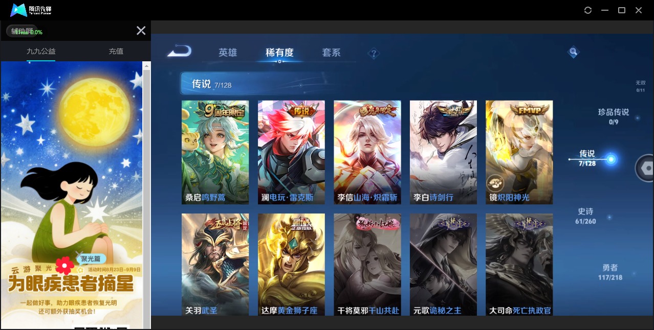 - [11526822]V7 13传说 98英雄 100皮肤 可修改实名 优质装备:云鹰飞将(小将军),一念神魔,时之恋人-刘备(电焊工),山海·炽霜斩(李信年限),霜月吟,澜逐花归海,琥珀纪元马超 传说皮:乘龙·铭钟鼎(赵云年限),乘龙·淬吴钩(孙策年限),落雪白狼,幻光神枪 限定皮:愿照·九州拓(澜年限),青龙志(铠年限),默契交锋-花木兰,寅虎·赤拳(老虎年限),山海·玄木吟(马可年限) 史诗皮:龙之律动,石田雨龙,茶境仙,怒海争锋,遇见神鹿,黄金分割率,千年之狐,高渐离燃音魔法,电玩·爆裂旋风,末日机甲-吕布,猫狗日记-孙策,乱世虎臣,水果甜心,星夜王子,暗隐猎兽者,鬼剑武藏,纤云弄巧,水晶猎龙者,曙光守护者,热力回旋,鹰眼统帅,魅力维加斯