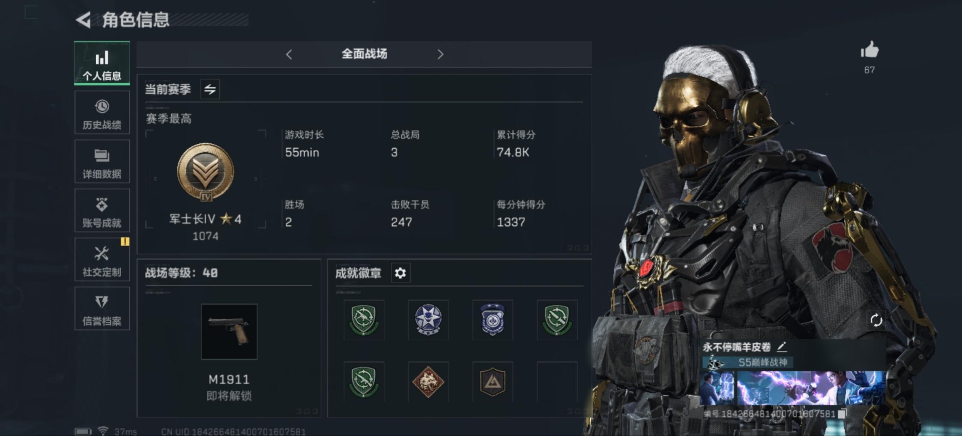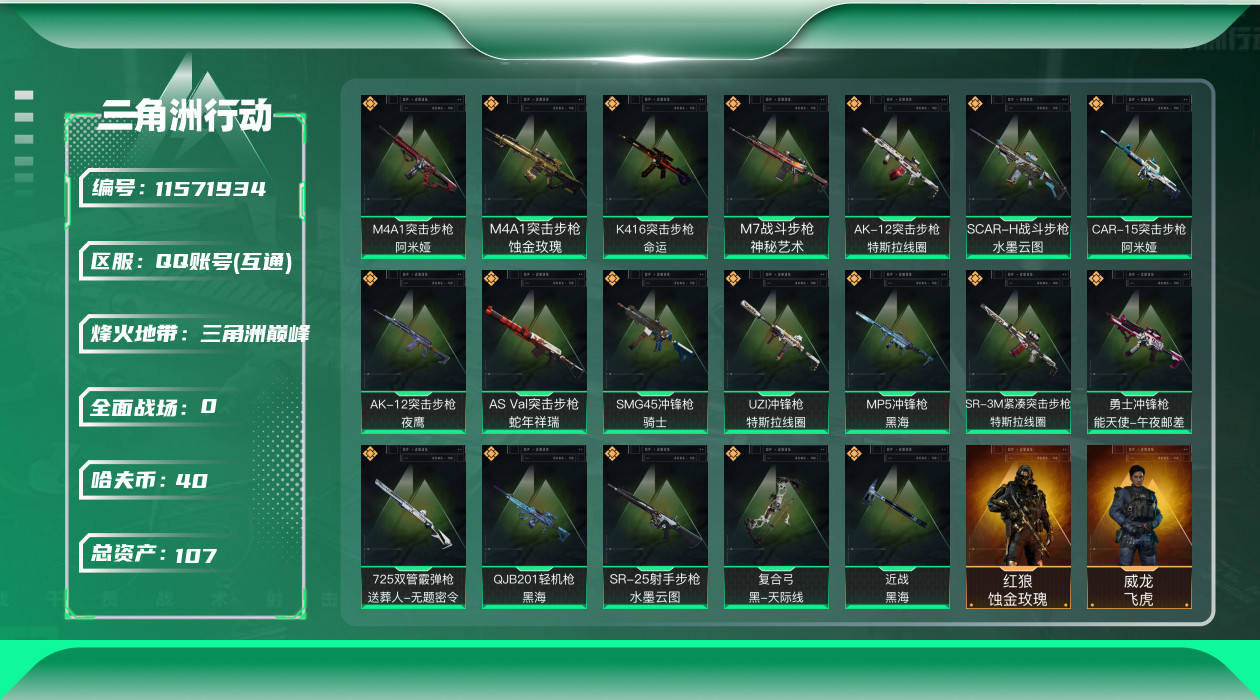 [11571934]总资产:107.6M 4干员外观 1近战传说 19传说枪械 哈夫币:40.108K 高级安全箱(9.17到期) 可二次 可修改实名 优质装备:近战-黑海,K416突击步枪-命运(典藏) 烽火地带段位:三角洲巅峰 全面战场段位:军士长 传说武器皮肤:SR-25射手步枪-水墨云图,SCAR-H战斗步枪-水墨云图,AS Val突击步枪-蛇年祥瑞,AK-12突击步枪-夜鹰,SMG45冲锋枪-骑士,AK-12突击步枪-特斯拉线圈,CAR-15突击步枪-阿米娅,SR-3M紧凑突击步枪-特斯拉线圈,UZI冲锋枪-特斯拉线圈,勇士冲锋枪-能天使-午夜邮差,复合弓-黑-天际线,M4A1突击步枪-阿米娅,725双管霰弹枪-送葬人-无题密令,MP5冲锋枪-黑海,M7战斗步枪-神秘艺术,M4A1突击步枪-蚀金玫瑰,QJB201轻机枪-黑海 干员外观:红狼-蚀金玫瑰,骇爪-水墨云图,威龙-飞虎,露娜-黑·天际线