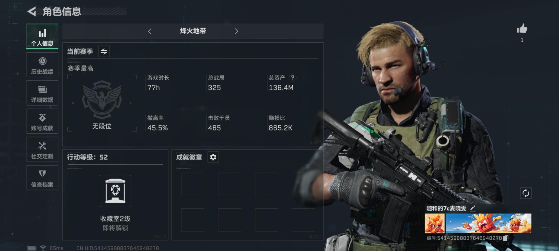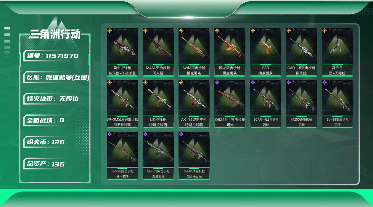 [11571970]总资产:136.4M 10传说枪械 哈夫币:120K 可二次 可修改实名 社交场景限制 烽火地带段位:无段位 全面战场段位:无段位 传说武器皮肤:UZI冲锋枪-特斯拉线圈,AWM狙击步枪-捞点薯条,腾龙突击步枪-捞点薯条,93R-捞点薯条,AK-12突击步枪-特斯拉线圈,SR-3M紧凑突击步枪-特斯拉线圈,勇士冲锋枪-能天使-午夜邮差,复合弓-黑-天际线,M4A1突击步枪-阿米娅,CAR-15突击步枪-阿米娅 史诗武器皮肤:SG552突击步枪-深海恐惧,QJB201轻机枪-Old Habits,SV-98狙击步枪-林中猎手,M250通用机枪-囚徒,SV-98狙击步枪-囚徒,SCAR-H战斗步枪-囚徒,QBZ95-1突击步枪-曙光