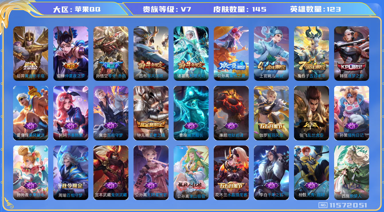 - [11852868]V7 1典藏 13传说 124英雄 284皮肤 可修改实名 优质装备:弑枪猎影(韩信典藏),炽阳神光,末日机甲-孙尚香(绿蚂蚱),地狱之眼,飞鸢探春,无双飞将,画中仙,遇见神鼓,霜月吟,澜逐花归海 传说皮:云诺千山,幻光神枪 珍宝阁皮:优雅恋人,女武神,玩趣恶龙 限定皮:愿照·山河定(司空震年限),鸣野蒿,至尊宝,高山流水,五谷丰年,游园惊梦,梁祝,李小龙,圣诞老人,孙行者 史诗皮:器灵·浮梦炉,化蝶舞,星界战将,石田雨龙,茶境仙,破空之剑,战舞者,海诺心动手记,决胜骁骑,百相守梦-黄忠,紫霞仙子,电玩小子(小书包),黄金分割率,特工魅影,江河有灵,真我赫兹(百里守约),百解令(蒙犽),高渐离燃音魔法,蒙恬荣光圣徽,无限星赏官,青蛇,偶像歌手,电玩·爆裂旋风,末日机甲-吕布,猫狗日记-孙策,乱世虎臣,节奏热浪,女仆咖啡,水果甜心,天才门将,星夜王子,心灵骇客,功夫厨神,德古拉伯爵,暗隐猎兽者,幽灵船长,鬼剑武藏,暗渊魔法,心灵战警,舞动绿茵,地狱岩魂,拒霜思,缤纷独角兽,乘风破浪,逐浪之夏,龙鼓争鸣,月团寄思,水晶猎龙者,曙光守护者,金属风暴,原初追逐者,圣诞狂欢,圣诞恋歌,鹰眼统帅,暗夜贵公子,魅力维加斯,黎明之约,无心