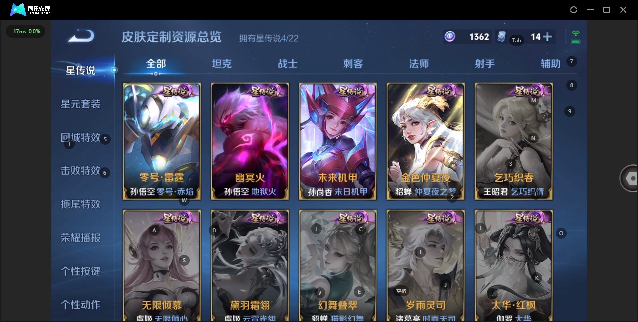 大乔白鹤梁神女,金蝉唐三藏,夏侯惇霜北刀,黄忠烈魂,甄姬女儿国国王,伽罗天狼溯光者,伽罗太华,赵云百木心枪,赵云龙胆,孙尚香异界灵契,鲁班七号乒乒小将,鲁班七号寅虎·瑞焰,后羿无尽星芒,露娜启示之音,后羿辉光之辰,镜匿光追影者,公孙离玉兔公主,司空震愿照·山河定,裴擒虎李小龙,李白诗剑行,花木兰青春决赛季,安琪拉魔法小厨娘,马可波罗山海·玄木吟,艾琳陌上桑,桑启鸣野蒿,猪八戒猪悟能,女娲补天,女娲愿照·千秋盛,孙悟空孙行者,孙悟空至尊宝,马超神威,云中君时之祈愿,妲己愿照·众生和,韩信傲雪梅枪,韩信飞衡,韩信逐梦之影,蔡文姬愿照·福禄聚,瑶时之祈愿,瑶山海·碧波行,澜愿照·九州拓,虞姬愿照·岁时盈,王昭君映山客,关羽武圣