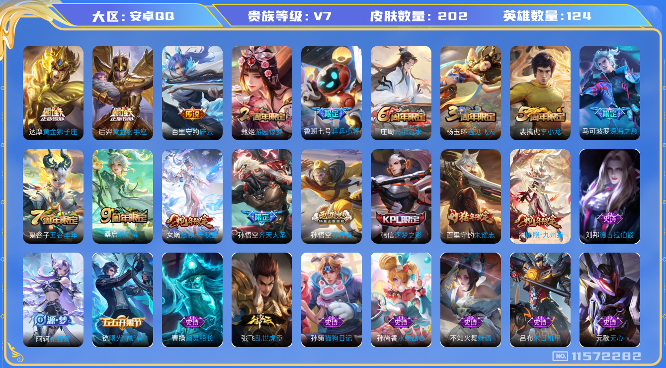 [11572282]V7 7传说 124英雄 202皮肤 可修改实名 优质装备:黄金狮子座,黄金射手座,碎云 珍宝阁皮:优雅恋人,玩趣恶龙 限定皮:愿照·九州拓(澜年限),愿照·千秋盛(女娲年限),鸣野蒿,遇见飞天,高山流水,齐天大圣,五谷丰年,游园惊梦,李小龙,逐梦之影,朱雀志(守约年限),孙行者,乒乒小将,深海之息(深海大菠萝) 史诗皮:苍鳞隐世,狼魂孤将,化蝶舞,特工魅影,千年之狐,魅语,百解令(蒙犽),无限星赏官,末日机甲-吕布,猫狗日记-孙策,乱世虎臣,修罗,水果甜心,德古拉伯爵,暗隐猎兽者,幽灵船长,心灵战警,纤云弄巧,拒霜思,逐浪之夏,水晶猎龙者,曙光守护者,热力回旋,金属风暴,鹰眼统帅,魅力维加斯,无心,未来纪元-赵云