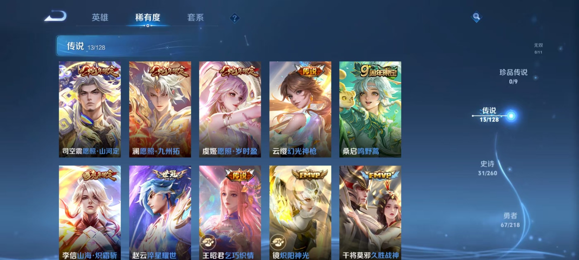 - [12297428]V8 2典藏 1珍品传说 25传说 123英雄 283皮肤 可修改实名 优质装备:鸣剑·曳影,星域神启(倪克斯贼亮),朽木白哉,黄金射手座,云鹰飞将(小将军),炽阳神光,一念神魔,末日机甲-孙尚香(绿蚂蚱),仲夏夜之梦(大飞蛾),零号·赤焰,地狱之眼,无双飞将,记忆之芯(机甲兔),电玩·雷克斯,澜逐花归海,涂山容容 传说皮:典韦战鼓燎原,祥瑞亨通 珍宝阁皮:妄想食味,万物之道 限定皮:愿照·九州拓(澜年限),愿照·福禄聚(蔡文姬年限),愿照·岁时盈(虞姬年限),愿照·山河定(司空震年限),愿照·众生和(妲己年限),愿照·千秋盛(女娲年限),逐霄战戟,陌上桑,鸣野蒿,至尊宝,傲雪梅枪,诗剑行,齐天大圣,五谷丰年,李小龙,孙行者,深海之息(深海大菠萝) 史诗皮:鸭鸭历险记-刘禅,器灵·浮梦炉,狼魂孤将,绮世丹青,瑰影绮梦,化蝶舞,灵蛊蚀心,谪仙醉月,龙之律动,雪豹·霜爪,百相守梦-周瑜,茶境仙,炽弈燎原,破空之剑,蒙犽顽岩魄,埋骨钱,琥珀纪元伽罗,蔬乡物语(鲁班七号),超元猎域,星界特工,百相守梦-黄忠,紫霞仙子,白龙吟,黄金分割率,特工魅影,江河有灵,百解令(蒙犽),高渐离燃音魔法,青蛇,偶像歌手,晚萤,猫狗日记-孙策,乱世虎臣,节奏热浪,摇滚巨星,水果甜心,星夜王子,功夫厨神,德古拉伯爵,暗隐猎兽者,幽灵船长,鬼剑武藏,暗渊魔法,天秀·启明,舞动绿茵,地狱岩魂,诗语江南,纤云弄巧,拒霜思,逐浪之夏,水晶猎龙者,曙光守护者,箭羽风息,金属风暴,原初追逐者,圣诞狂欢,圣诞恋歌,鹰眼统帅,暗夜贵公子,赏金猎手,未来纪元-赵云