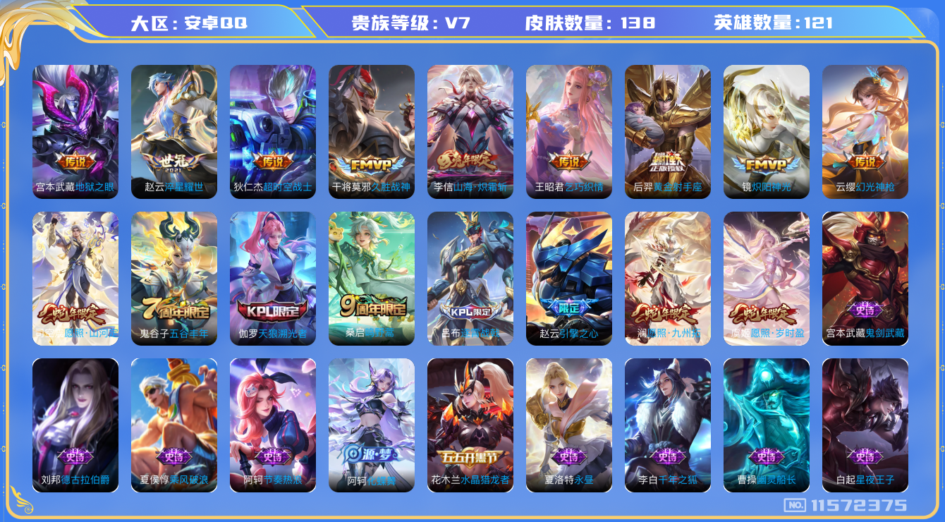 [11572375]V7 13传说 121英雄 138皮肤 可修改实名 优质装备:黄金射手座,久胜战神,炽阳神光,地狱之眼,乞巧织情,淬星耀世,超时空战士-狄仁杰,山海·炽霜斩(李信年限) 传说皮:幻光神枪 珍宝阁皮:女武神 限定皮:愿照·九州拓(澜年限),愿照·岁时盈(虞姬年限),愿照·山河定(司空震年限),逐霄战戟,鸣野蒿,五谷丰年,天狼溯光者,引擎之心 史诗皮:绮世丹青,化蝶舞,龙之律动,织梦人,电玩小子(小书包),特工魅影,千年之狐,永昼,晚萤,末日机甲-吕布,时之恋人-孙尚香,乱世虎臣,节奏热浪,女仆咖啡,水果甜心,星夜王子,德古拉伯爵,幽灵船长,鬼剑武藏,心灵战警,乘风破浪,逐浪之夏,水晶猎龙者,鹰眼统帅,魅力维加斯