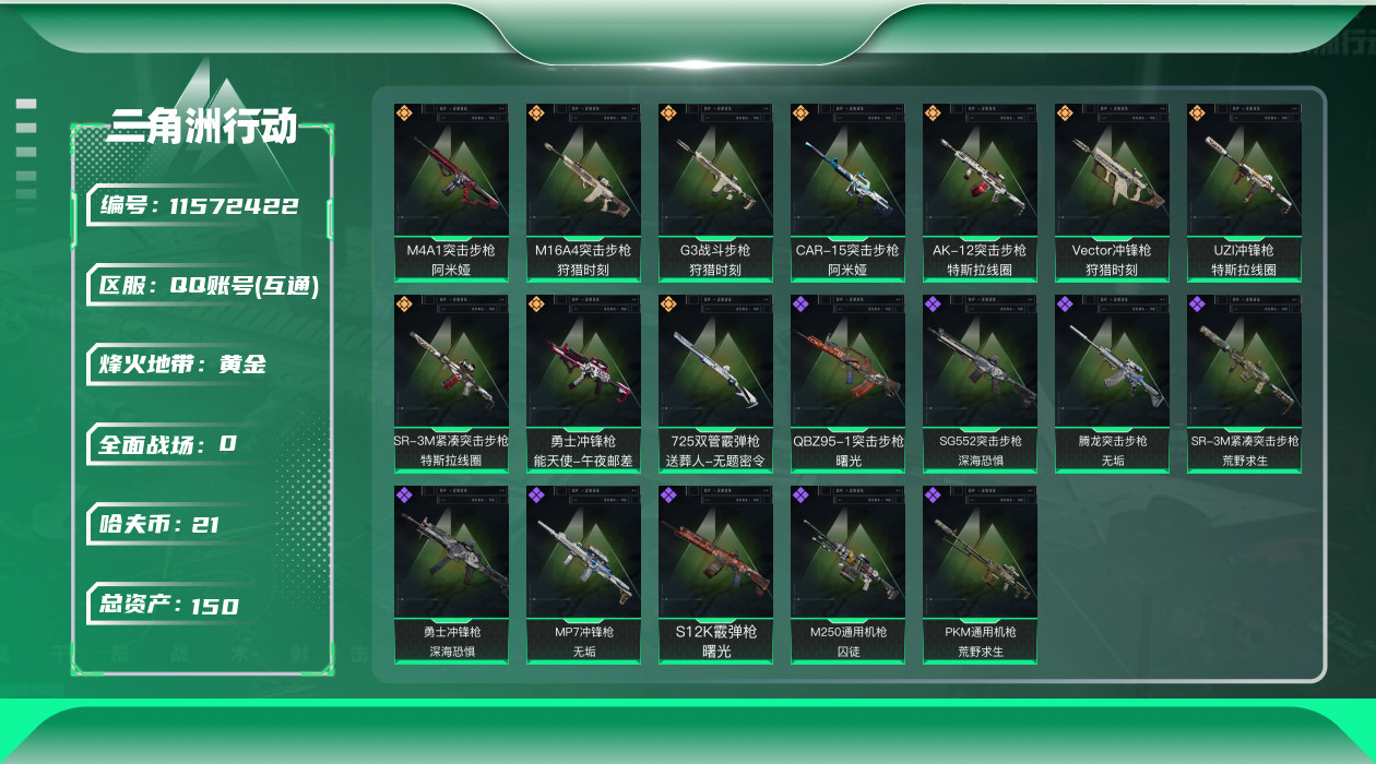 [11572422]总资产:150.8M 10传说枪械 哈夫币:21.372K 高级安全箱(9.17到期) 可二次 可修改实名 烽火地带段位:黄金 全面战场段位:无段位 传说武器皮肤:UZI冲锋枪-特斯拉线圈,M16A4突击步枪-狩猎时刻,AK-12突击步枪-特斯拉线圈,SR-3M紧凑突击步枪-特斯拉线圈,勇士冲锋枪-能天使-午夜邮差,Vector冲锋枪-狩猎时刻,G3战斗步枪-狩猎时刻,725双管霰弹枪-送葬人-无题密令,M4A1突击步枪-阿米娅,CAR-15突击步枪-阿米娅 史诗武器皮肤:勇士冲锋枪-深海恐惧,SG552突击步枪-深海恐惧,PKM通用机枪-荒野求生,M250通用机枪-囚徒,腾龙突击步枪-无垢,MP7冲锋枪-无垢,SR-3M紧凑突击步枪-荒野求生,QBZ95-1突击步枪-曙光,S12K霰弹枪-曙光