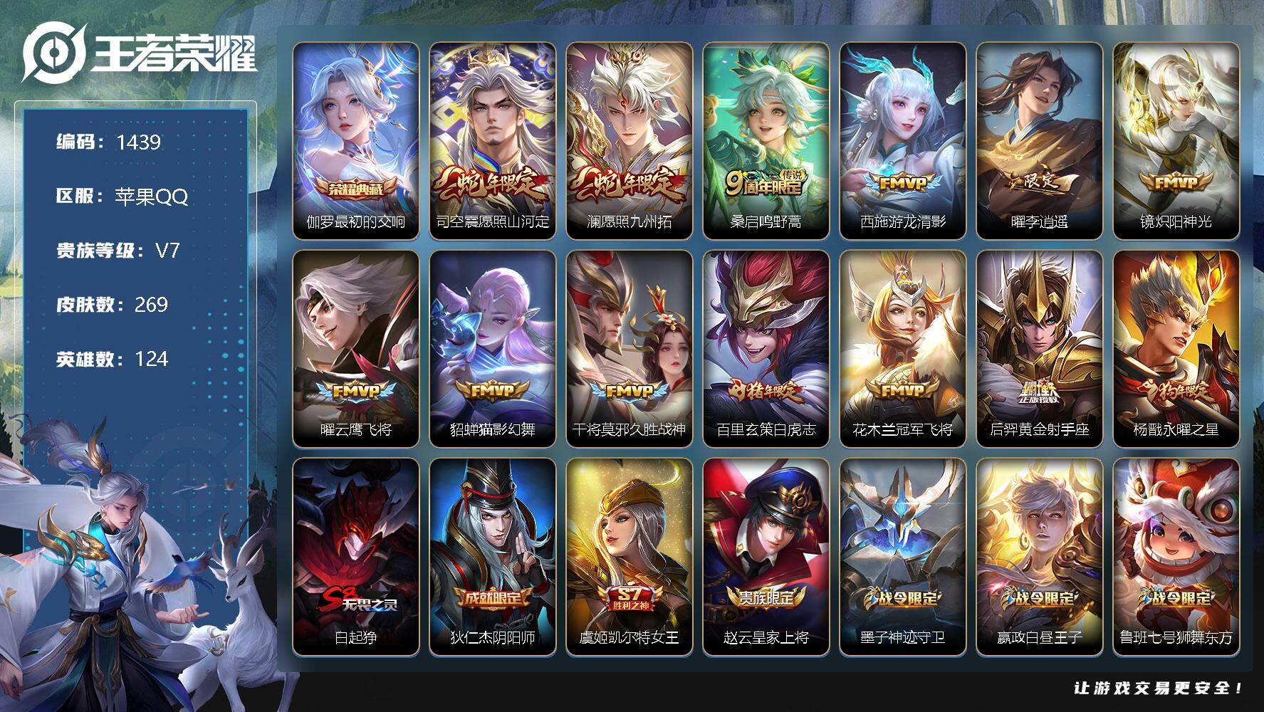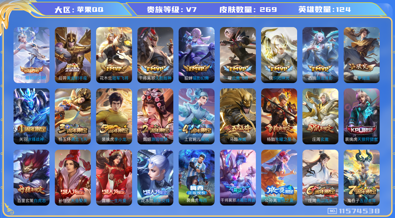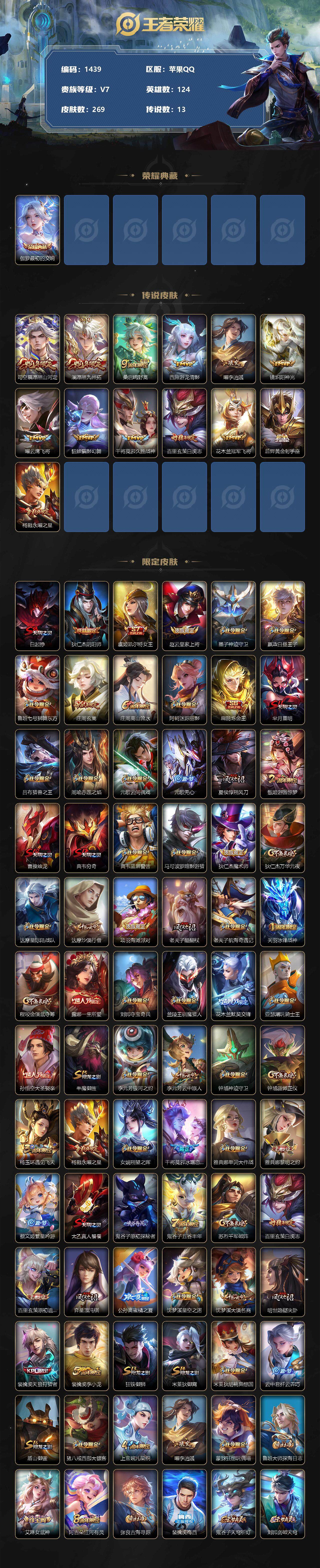 [11574538]【商品标题】:苹果Q-V1-至尊星耀III段位-124英雄-269皮肤-1典藏-0珍品无双-0无双-0珍品传说-13传说-78史诗
