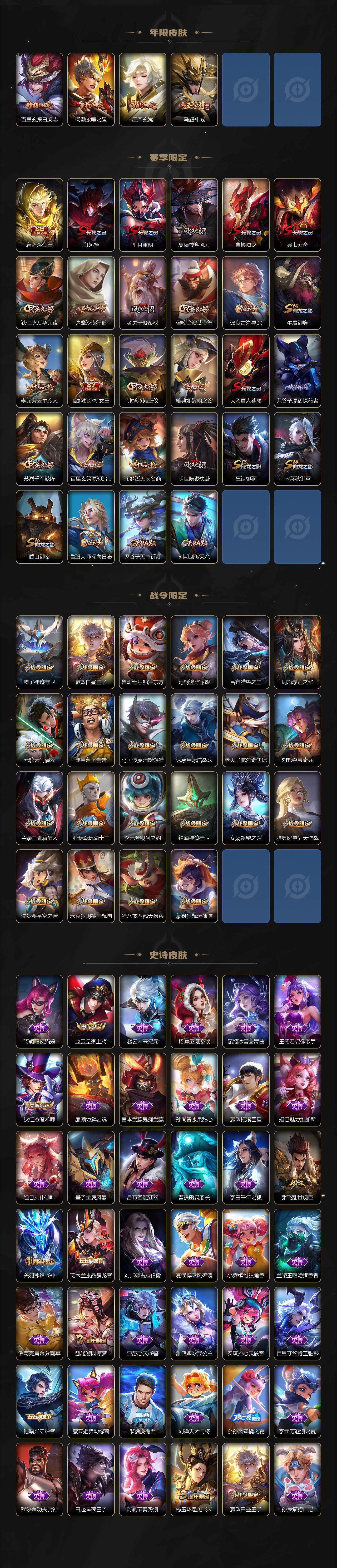 【赛季限定】:扁鹊炼金王,白起狰,芈月重明,夏侯惇朔风刀,曹操烛龙,典韦穷奇,狄仁杰万华元夜,达摩沙漠行僧,老夫子醍醐杖,程咬金演武夺筹,张良古海寻踪,牛魔御旌,李元芳云中旅人,虞姬凯尔特女王,钟馗驱傩正仪,雅典娜黎明之约,太乙真人饕餮,鬼谷子原初探秘者,苏烈千军破阵,百里玄策原初追逐者,弈星混沌棋,沈梦溪大漠名商,明世隐疑决卦,狂铁御狮,米莱狄御霄,盾山御銮,鲁班大师探海日志,鬼谷子天穹祈灯,刘邦剑破天穹