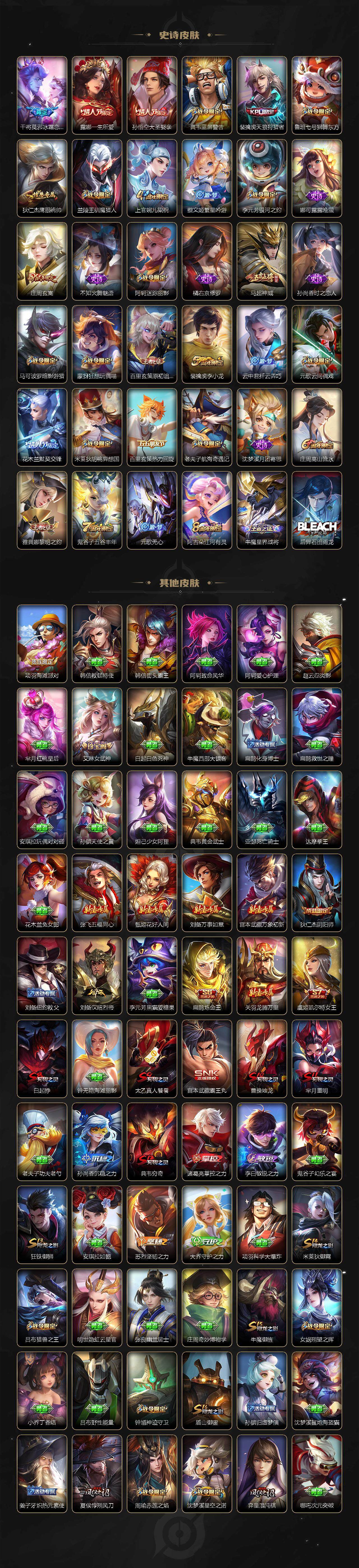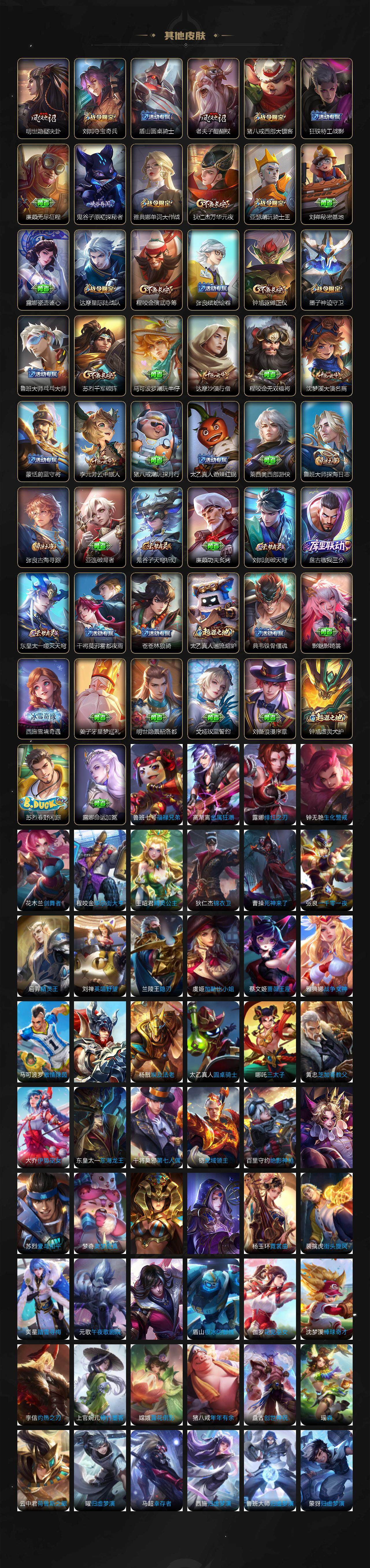 【限定皮肤】:白起狰,狄仁杰阴阳师,虞姬凯尔特女王,赵云皇家上将,墨子神迹守卫,嬴政白昼王子,鲁班七号狮舞东方,庄周玄嵩,庄周高山流水,阿轲迷踪丽影,扁鹊炼金王,芈月重明,吕布猎兽之王,周瑜赤莲之焰,元歌云间偶戏,元歌无心,夏侯惇朔风刀,甄姬游园惊梦,曹操烛龙,典韦穷奇,典韦蓝屏警告,马可波罗暗影游猎,狄仁杰魔术师,狄仁杰万华元夜,达摩星际陆战队,达摩沙漠行僧,项羽海滩派对,老夫子醍醐杖,老夫子航海奇遇记,关羽冰锋战神,程咬金演武夺筹,露娜一生所爱,刘邦夺宝奇兵,兰陵王驯魔猎人,花木兰默契交锋,亚瑟潮玩骑士王,孙悟空大圣娶亲,牛魔御旌,李元芳银河之约,李元芳云中旅人,钟馗神迹守卫,钟馗驱傩正仪,杨玉环遇见飞天,杨戬永曜之星,女娲朔望之晖,干将莫邪冰霜恋舞曲,雅典娜单词大作战,雅典娜黎明之约,蔡文姬繁星吟游,太乙真人饕餮,鬼谷子原初探秘者,鬼谷子五谷丰年,苏烈千军破阵,百里玄策白虎志,百里玄策原初追逐者,弈星混沌棋,公孙离蜜橘之夏,沈梦溪星空之诺,沈梦溪大漠名商,明世隐疑决卦,裴擒虎天狼狩猎者,裴擒虎李小龙,狂铁御狮,米莱狄御霄,米莱狄胡桃异想国,云中君纤云弄巧,盾山御銮,猪八戒西部大镖客,上官婉儿梁祝,曜李逍遥 ,蒙犽狂想玩偶喵,鲁班大师探海日志,艾琳女武神,阿古朵江河有灵,张良古海寻踪,裴擒虎梅西,鬼谷子天穹祈灯,刘邦剑破天穹